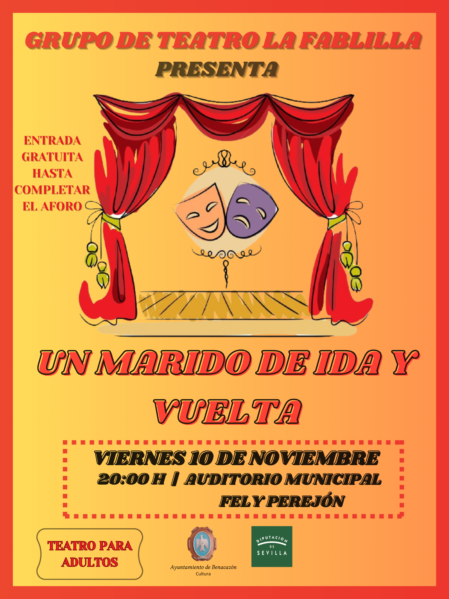 El Ayuntamiento de Benacazón informa sobre la obra de teatro para adultos "UN MARIDO DE IDA Y VUELTA", que representará el Grupo de Teatro La Fablilla el próximo viernes 10 de noviembre, a las 20:00 h. en el Auditorio Municipal Fely Perejón. Actividad organizada por la Concejalía municipal de Cultura, dentro del Programa Cultural 2023/2024 de la Diputación de Sevilla. Entrada Gratuita hasta completar el aforo de la sala. La Delegada del área, María Rosario Fernández Santos, os invita a participar en esta actividad, que forma parte de la Programación Cultural para la nueva temporada 2023/2024 en Benacazón. OS ESPERAMOS!!