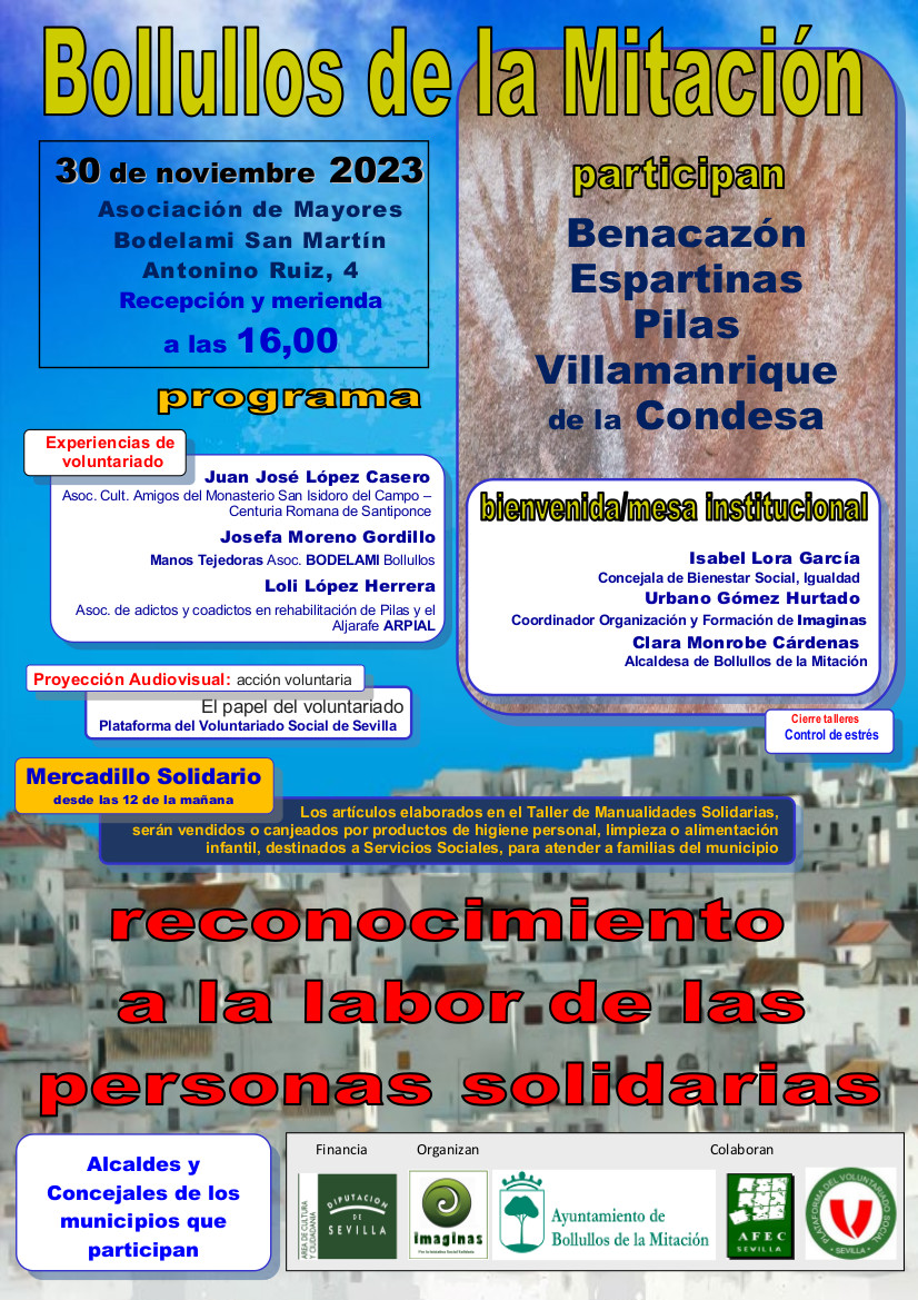 El acto se celebrará el próximo 30 de noviembre en Bollullos de la Mitación, organizado por la Diputación de Sevilla, el Ayuntamiento de Bollullos de la Mitación y la Asociación de Desarrollo Social Participativo IMAGINAS, con la colaboración de AFEC Sevilla y la Plataforma del Voluntariado Social, contando además con la participación de los Ayuntamientos de Benacazón, Espartinas, Pilas y Villamanrique de la Condesa.