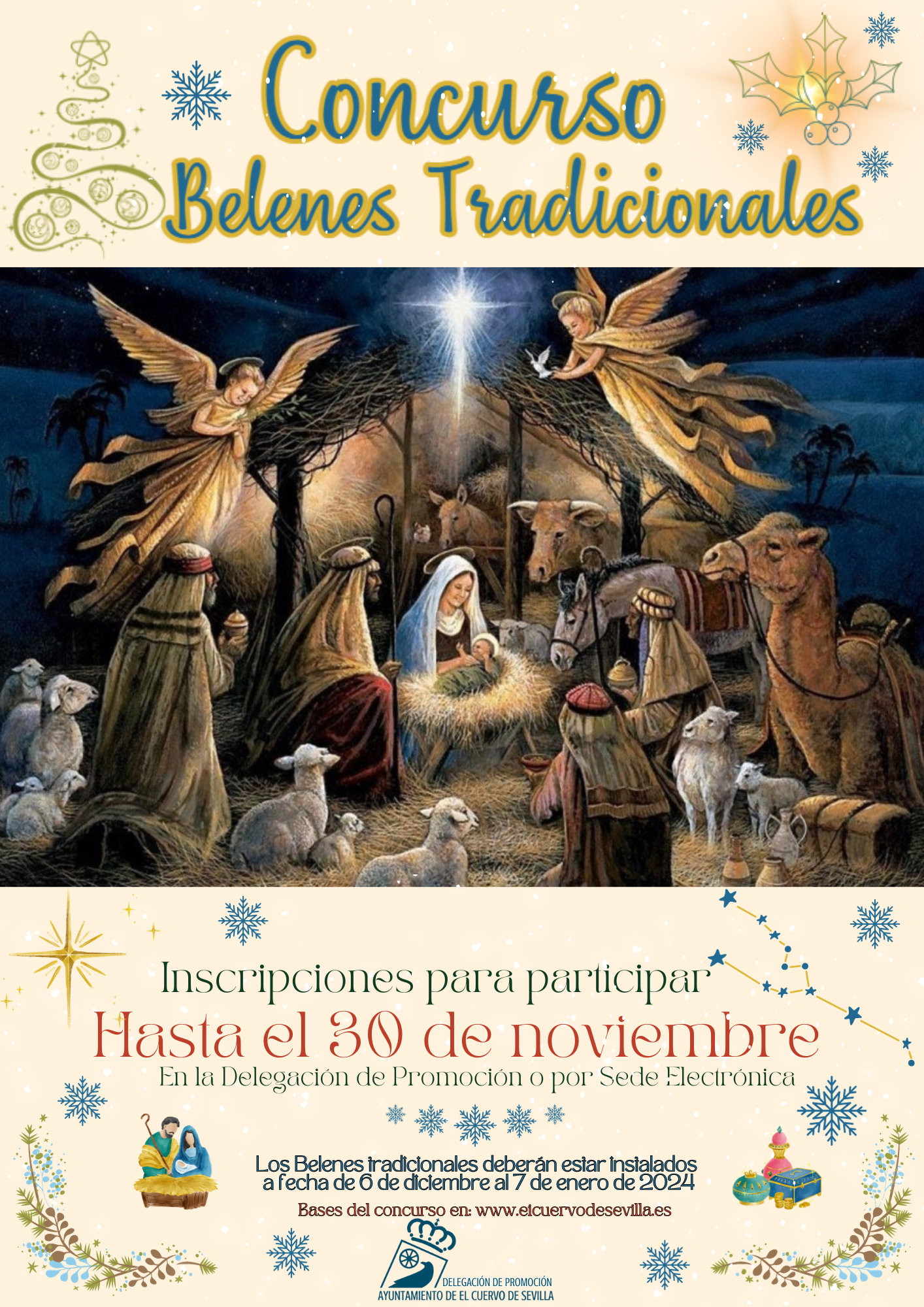 2. Todas las personas interesadas en participar en el Concurso de Belenes deberán inscribirse desde el día siguiente a la publicación de las bases hasta el 30 de Noviembre, en el Registro General del Ayuntamiento de El Cuervo o a través de la Sede Electrónica de la página web municipal: www.elcuervodesevilla.es, cumplimentando la correspondiente ficha de inscripción.