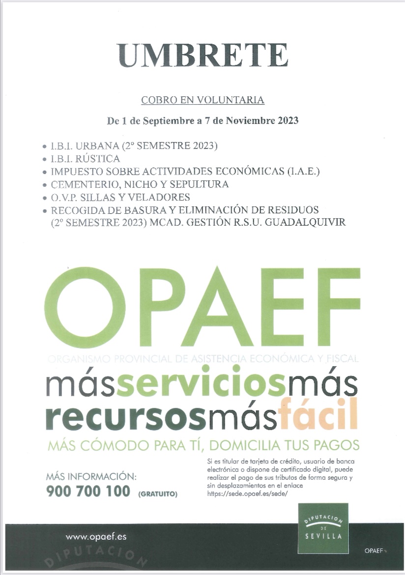 Los vecinos y vecinas de Umbrete pueden abonar en voluntaria hasta el 7 de noviembre el segundo semestre del Impuesto de Bienes Inmuebles (IBI). Asimismo, será también posible abonar hasta esa misma fecha el pago correspondiente a: