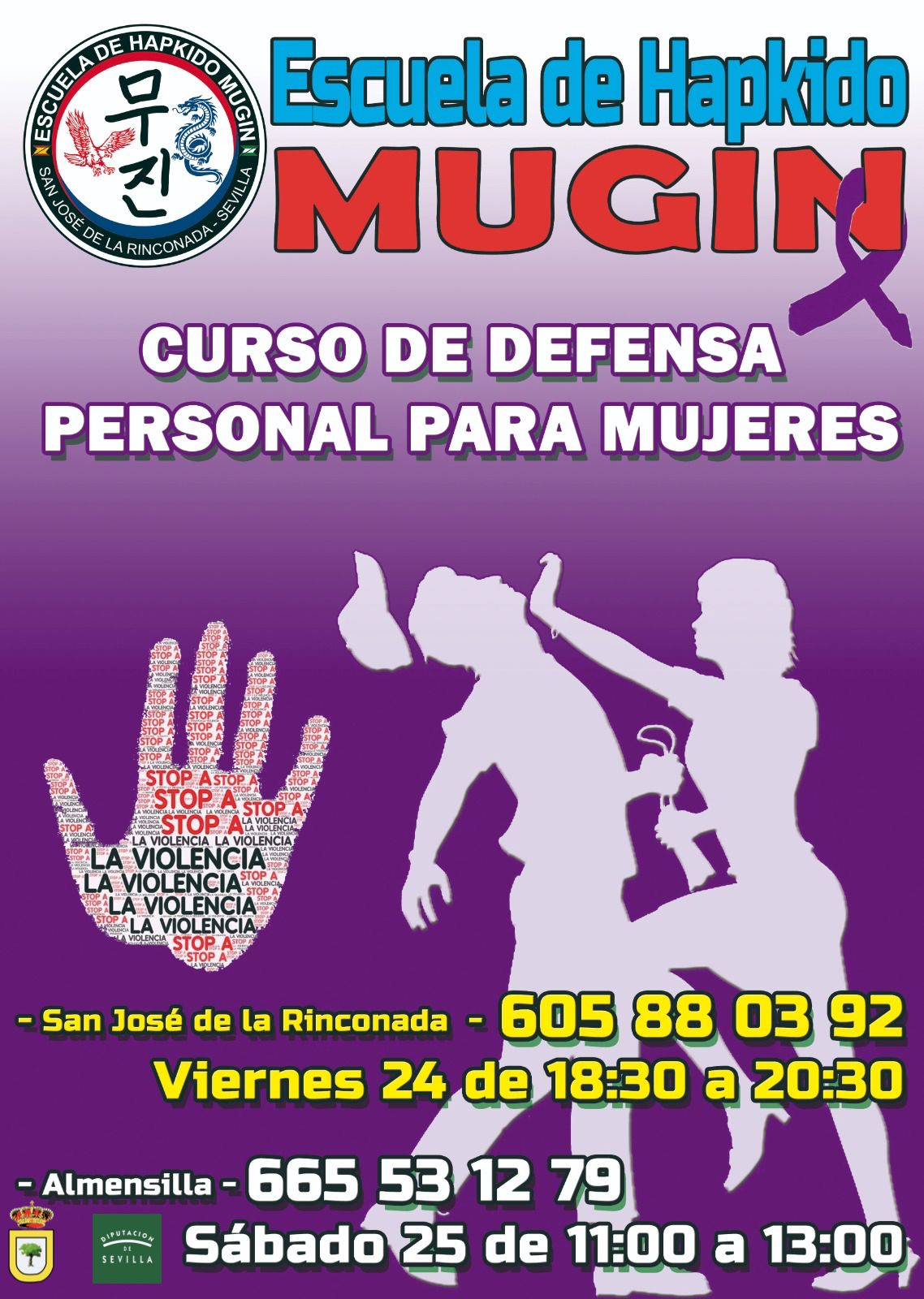 El próximo sábado 25 de noviembre se impartirá en la Escuela de Hapkido de Almensilla, en horario de 11:00 a 13:00, un seminario de DEFENSA PERSONAL FEMENINA totalmente gratis, con motivo del Día Internacional contra la violencia de género. Tendremos una introducción, pinceladas y conceptos básicos enfocados a la defensa personal.