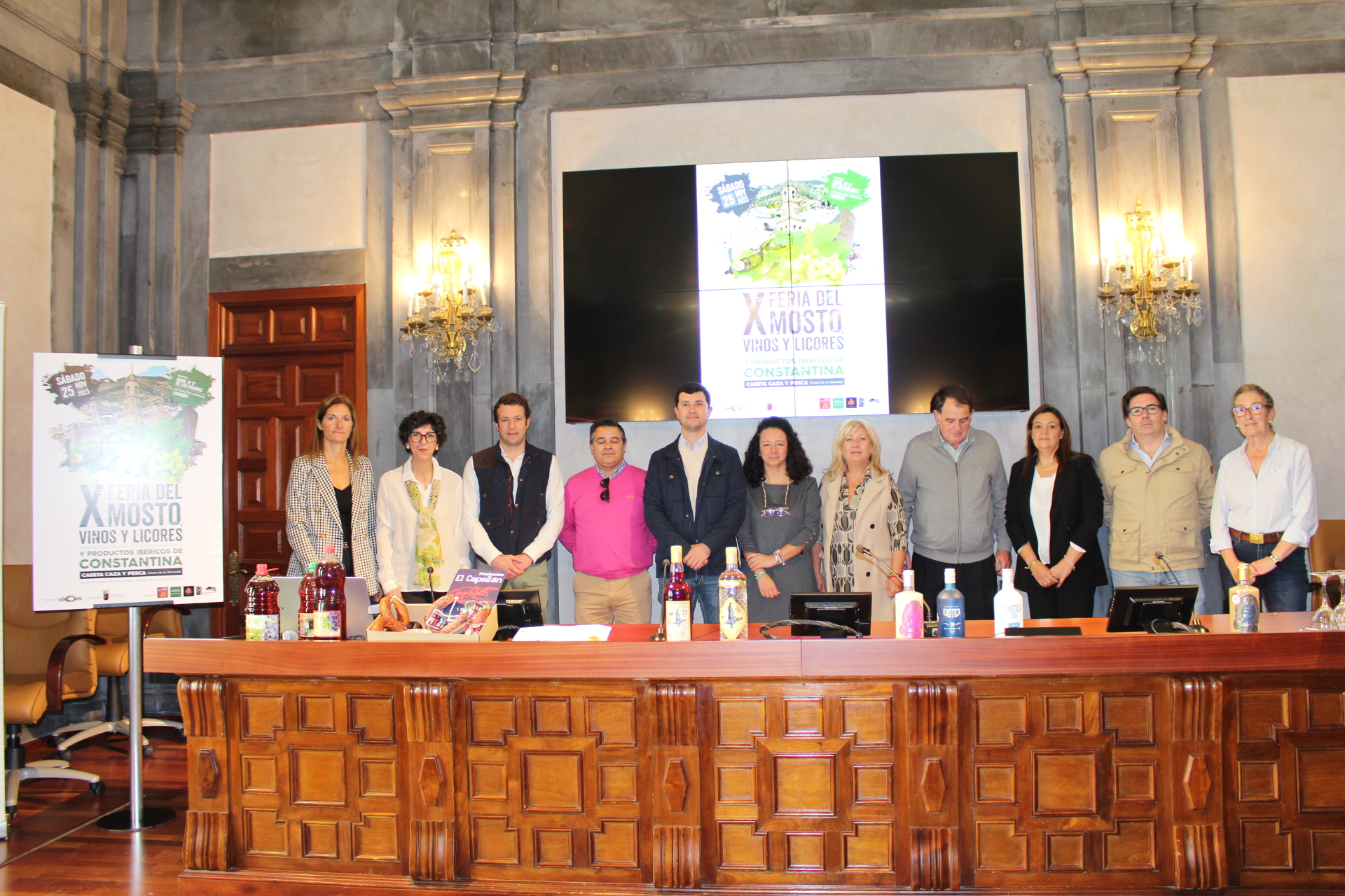 El alcalde de Constantina, Rubén Rivera, acompañado por los diputados provinciales María del Carmen Gabella, Mónica Zamora y Enrique Cornello, junto a la concejal delegada de Turismo del Ayuntamiento, Mati Rueda y el presidente de ADECCONS, Jaime Tornay presentaron ayer en la Casa de la Provincia de Sevilla la X Feria del Mosto, Vinos, Licores y Productos Ibéricos de Constantina. También estuvieron presentes representantes de algunas de las empresas expositoras.