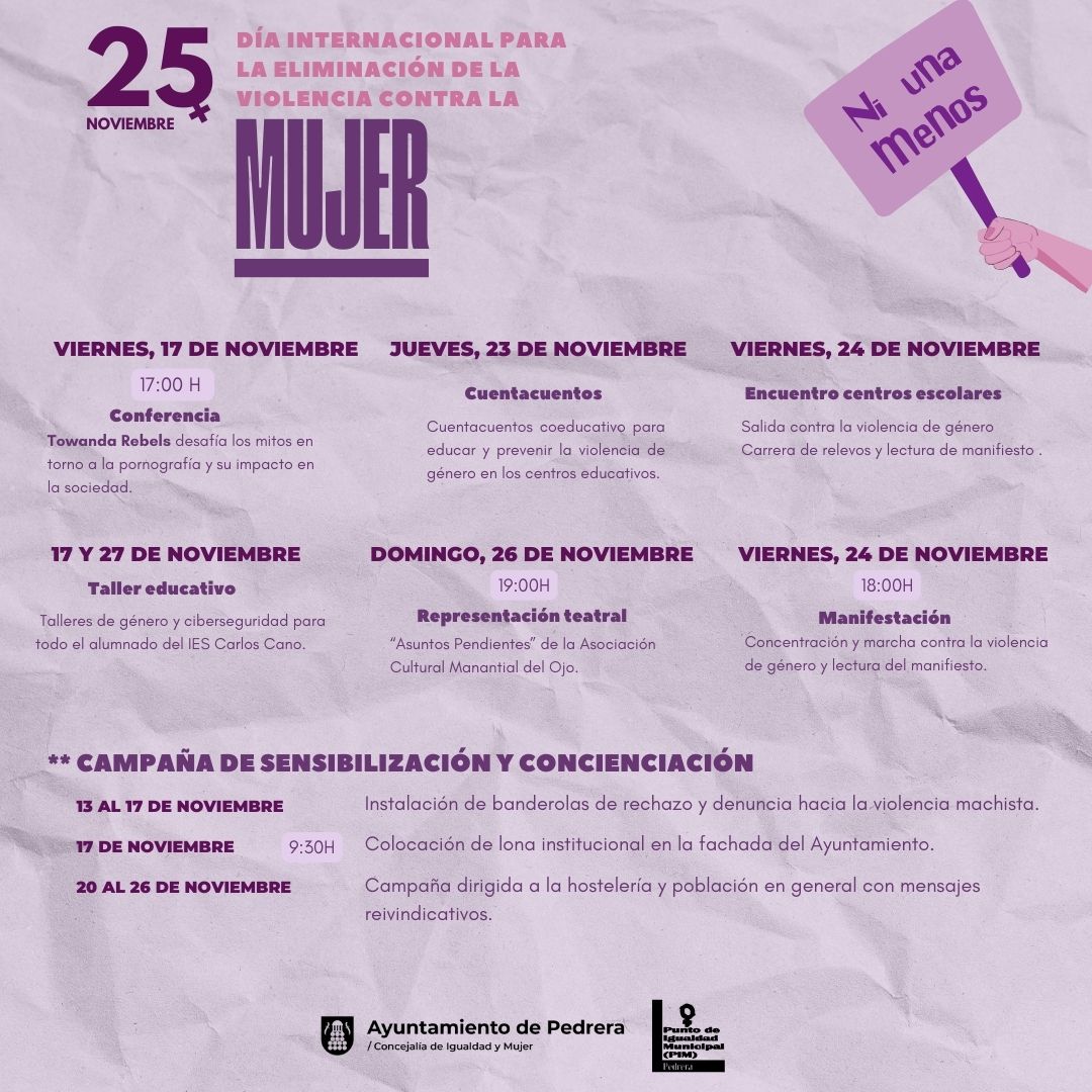 El Ayuntamiento de Pedrera despliega la programación con motivo del 25 de noviembre. Comienza esta semana con la colocación de la lona institucional en la fachada del Ayuntamiento, así como la instalación de banderolas de rechazo y denuncia hacia la violencia machista por la calle Primero de Mayo. También este viernes se celebra una conferencia impartida por 'Towanda Rebels', activistas, escritoras y comunicadoras feministas, que se llama 'Hablemos de pornografía para prevenir las violencias', a las 17:00h en el Teatro Municipal.
