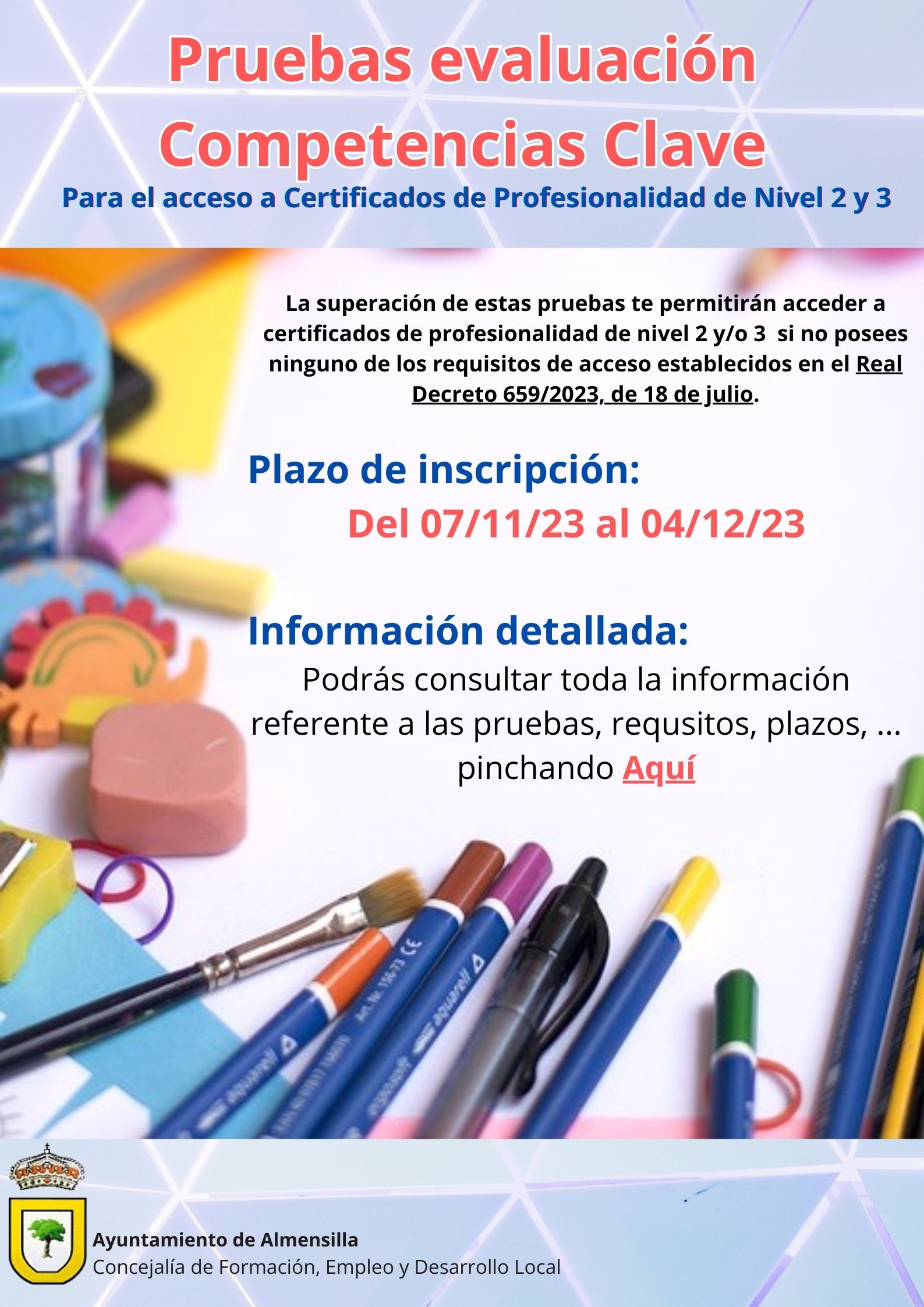 Informamos que hasta el próximo 04/12/23 se encuentra abierto el plazo de solicitud para la convocatoria 2023 de las pruebas de evaluación competencias clave para el acceso a los certificados de profesionalidad de nivel 2 y 3.