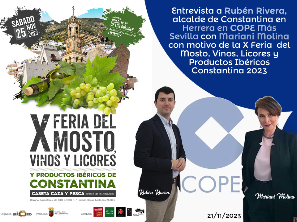 Entrevista a Rubén Rivera, alcalde de Constantina con motivo de la X Feria del Mosto, Vinos, Licores y Productos Ibéricos 2023 en Herrera en COPE Más Sevilla con Mariani Molina, ayer martes 21 de noviembre de 2023.