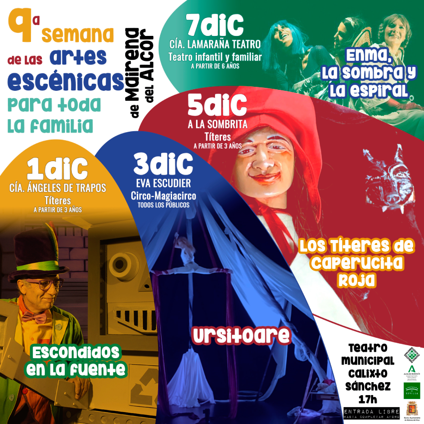 El programa continúa el domingo 3 de diciembre con circo-magiacirco por Eva Escudier, que trae en Mairena del Alcor su espectáculo 'Ursitoare'. El martes 5 'Los títeres de Caperucita Roja' de la compañía A la sombrita títeres. Y el jueves 7 de diciembre 'Enma. La sombra y la espiral' teatro infantil y familiar con la compañía La maraña teatro.