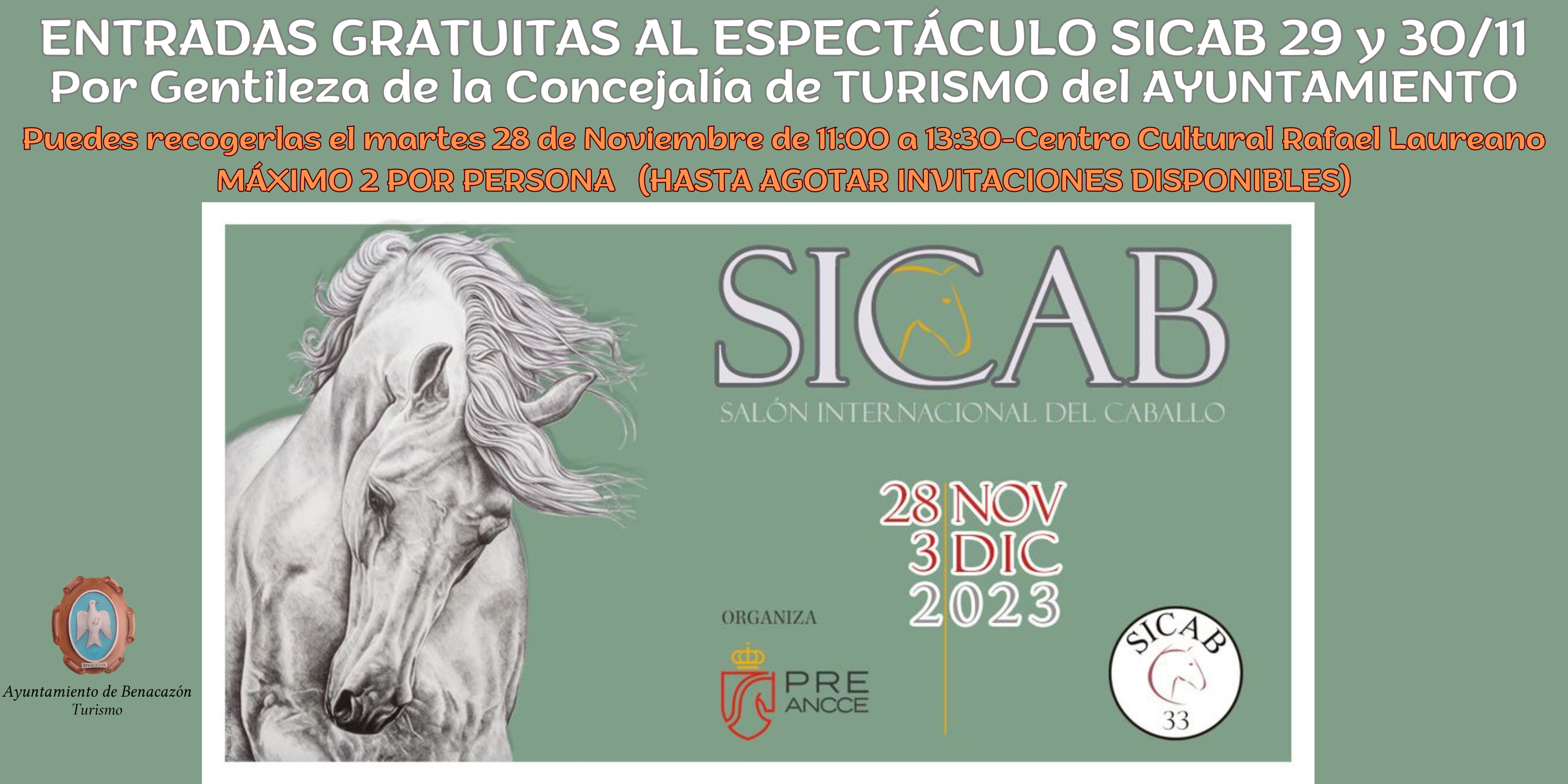 El Ayuntamiento de Benacazón informa que, por gentileza de la Delegación municipal de Turismo, se van a repartir 70 invitaciones (distribuidas entre los dos días) para asistir al Espectáculo del Salón Internacional del Caballo SICAB 2023 miércoles 29 y jueves 30 de noviembre, a las 20:00 horas. Siendo el desplazamiento a cargo del interesado!!