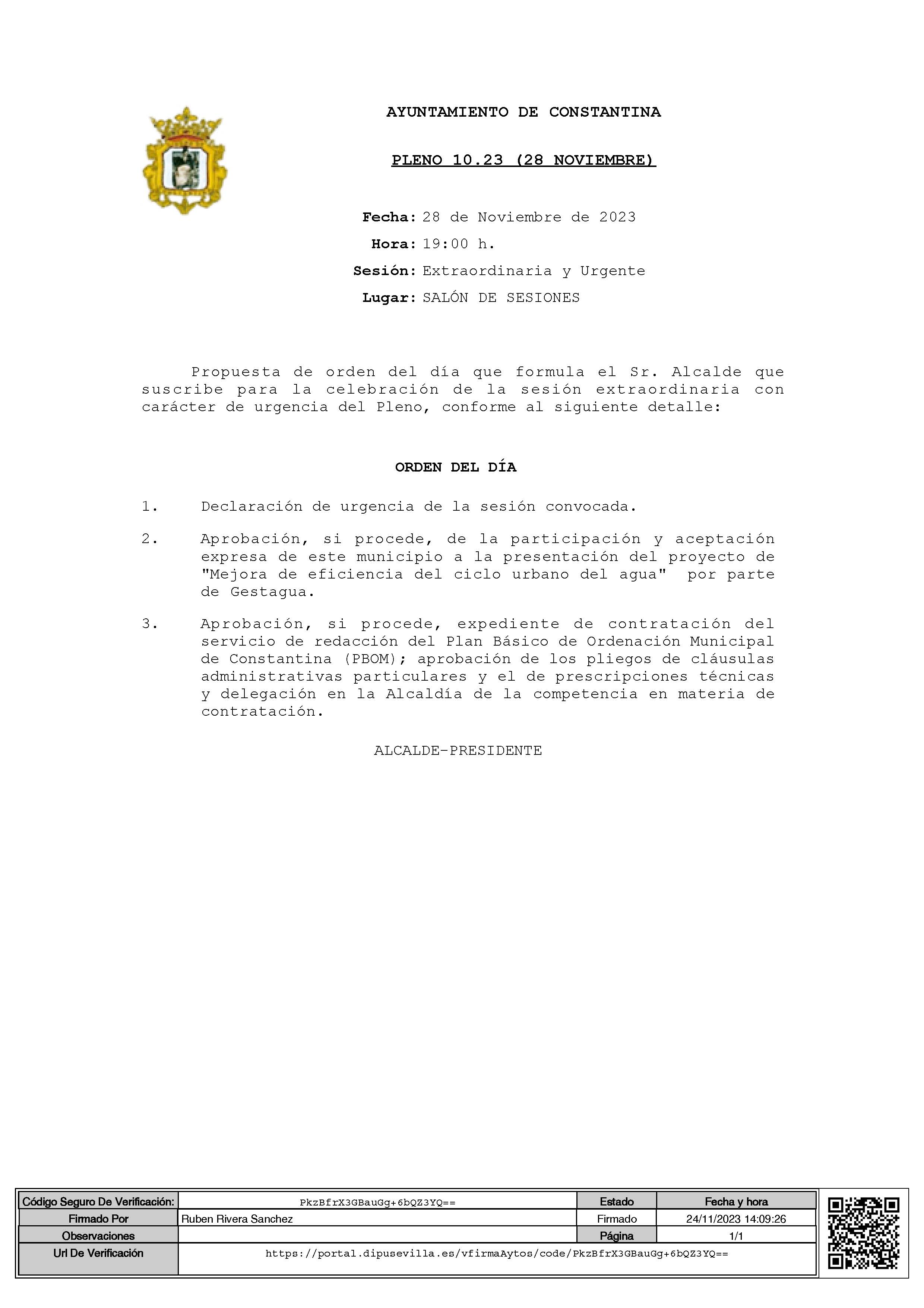 CONVOCATORIA DE SESIÓN EXTRAORDINARIA Y URGENTE PLENO CONSTANTINA
