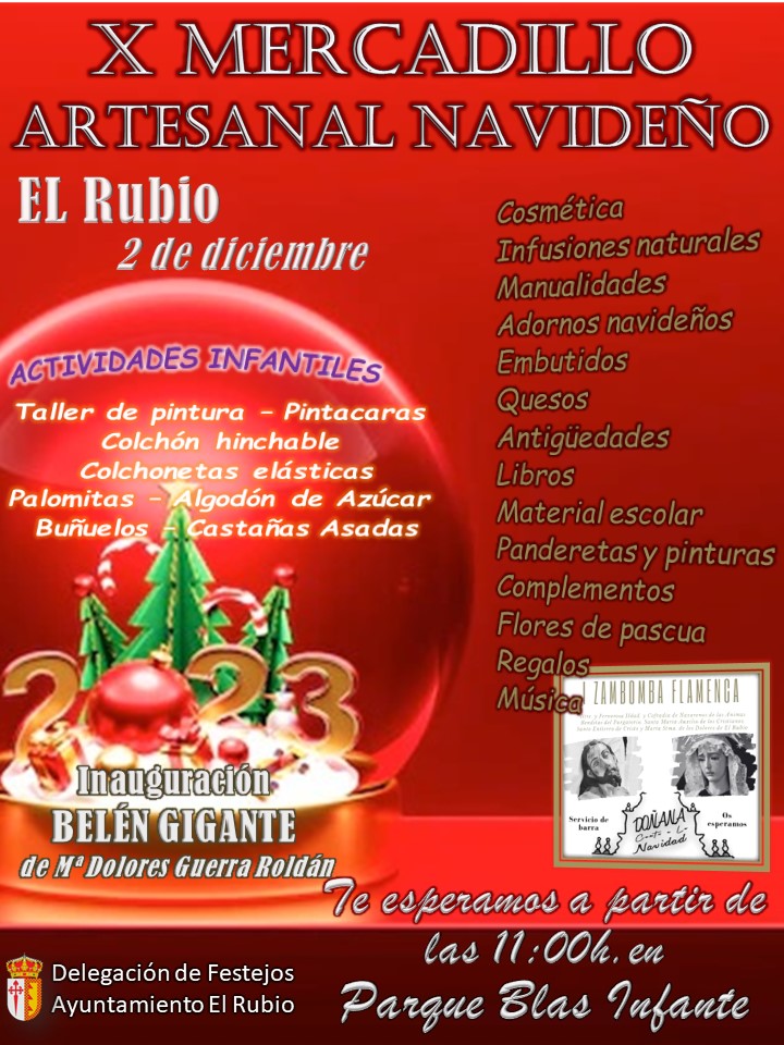 X MERCADILLO ARTESANAL NAVIDEÑO El sábado 2 de diciembre, te esperamos a partir de las 11 de la mañana, en el Parque Blas Infante para disfrutar de una jornada festiva y de convivencia.