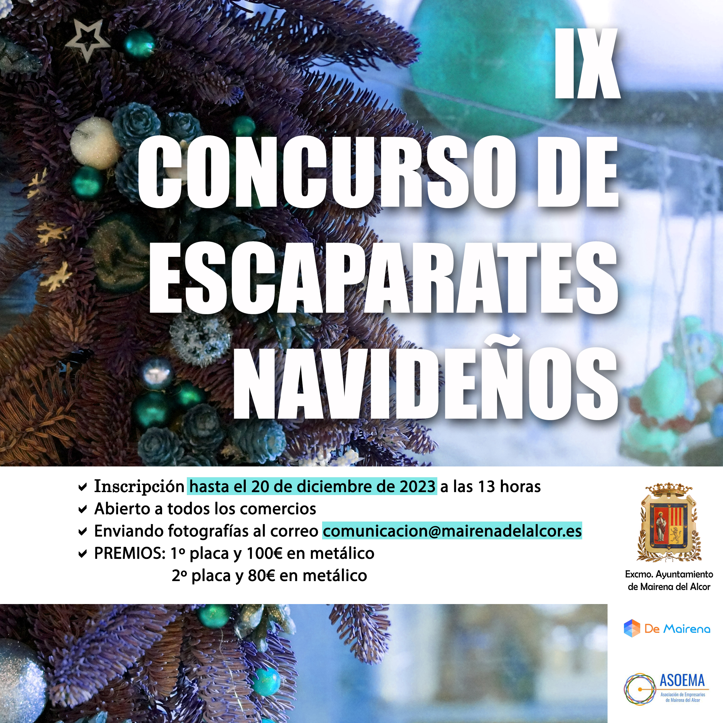 Para celebrar las fiestas navideñas y con el objeto de dinamizar, fomentar e impulsar el comercio mairenero, el Ayuntamiento de Mairena del Alcor, a través de la Delegación de Comercio, y en colaboración con la Asociación de empresarios de Mairena del Alcor ASOEMA, convoca el IX Concurso de Escaparates Navideños.