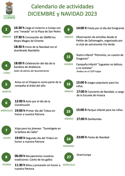 Imagen Imágenes Ubicación Categoría noticia Cultura Mostrar en el carrusel de la sección No Fecha Mié, 29/11/2023 - 09:59 Más información http://www.coripe.es/es/actualidad/Calendario-de-actividades-para-Diciembre-y-N…