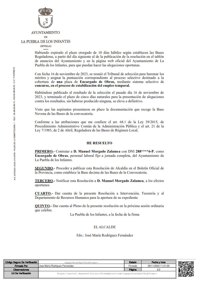 Imagen Imágenes Ubicación Categoría noticia Empleo Mostrar en el carrusel de la sección No Fecha Mié, 29/11/2023 - 12:27 Más información http://www.lapuebladelosinfantes.es/es/actualidad/noticias/Anuncio-del-nombrami…