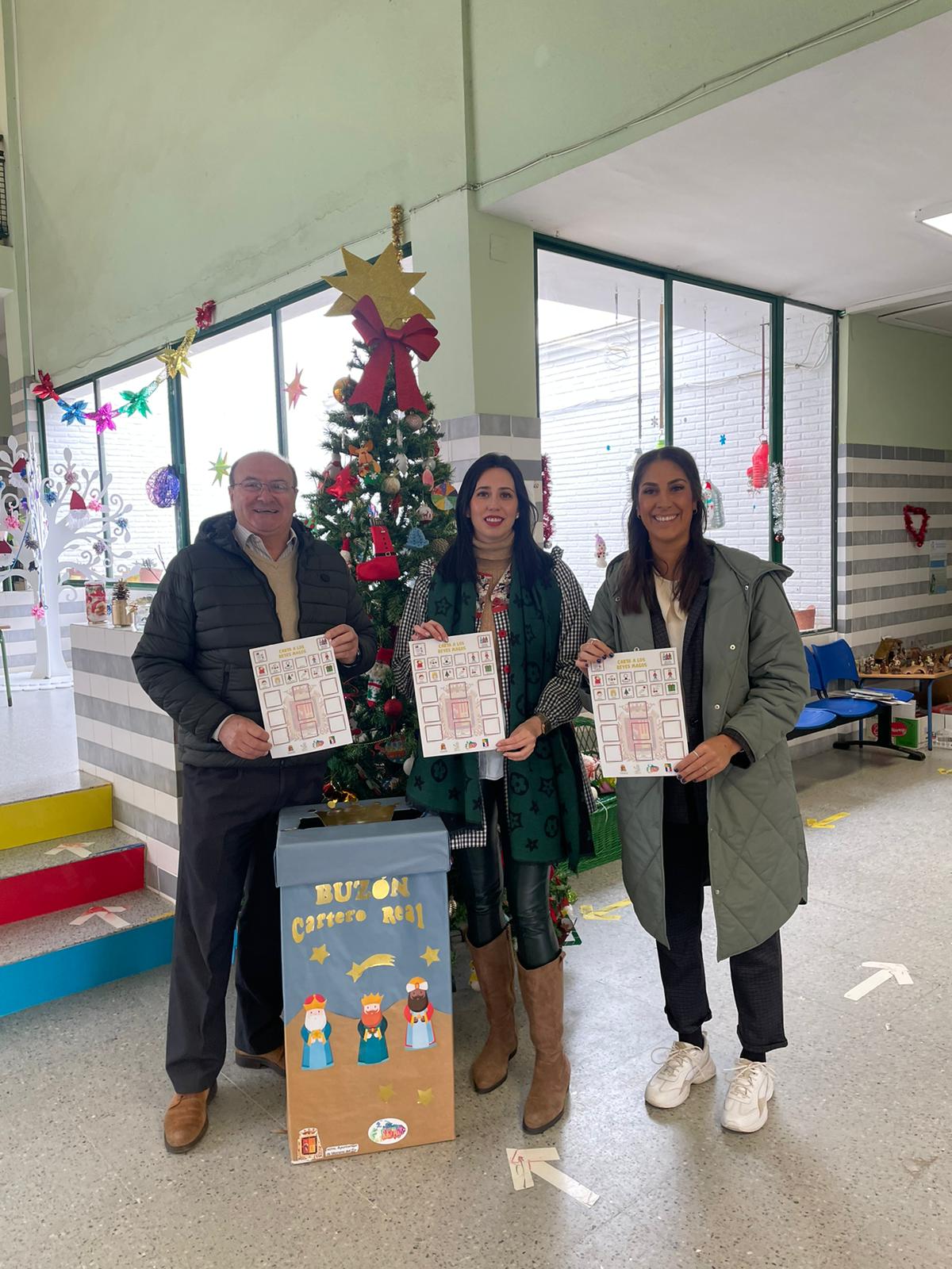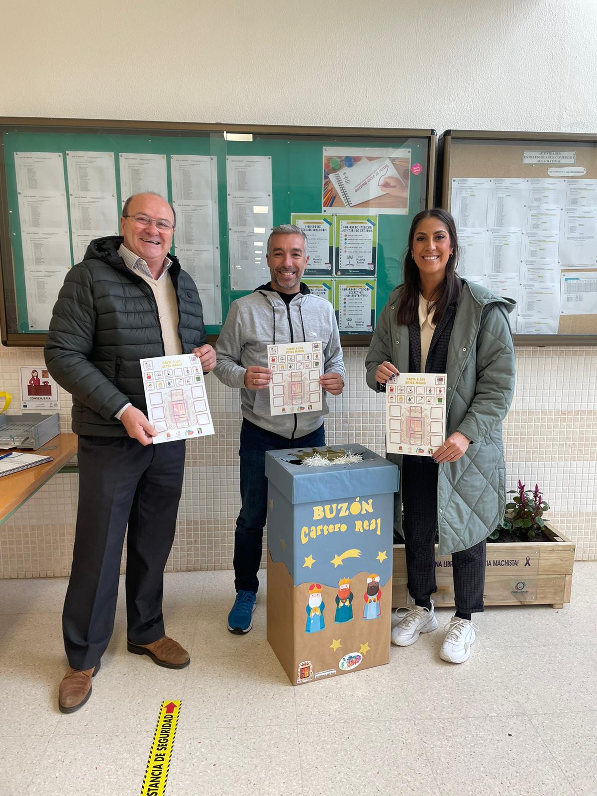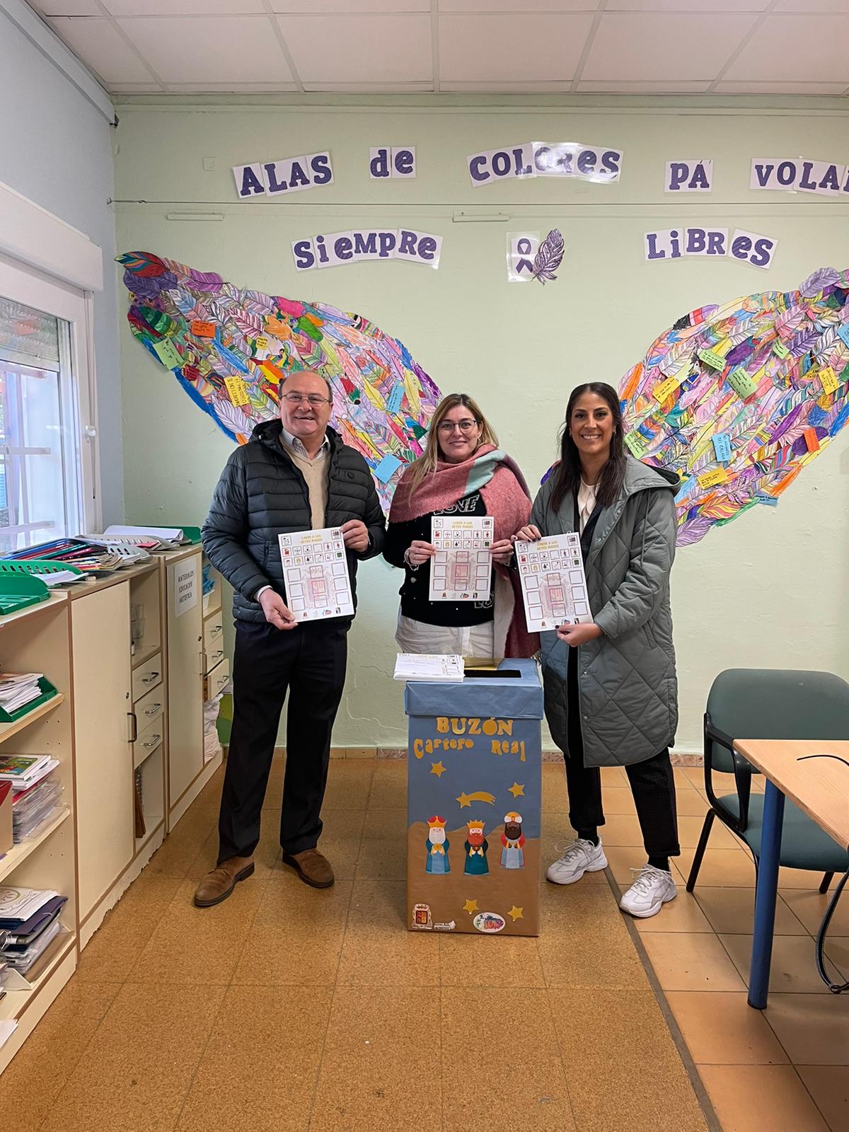 Las concejalas de Comunicación, Movilidad y Educación, Belén Gutiérrez, Ana María Guillén y Gloria Guillén, respectivamente, y Manolo Bustos de la Asociación Amigos de los Reyes Magos han repartido esta mañana los buzones de la Cartera Real en todos los colegios de la localidad, junto a unas cartas con pictogramas para que todos los menores maireneros hagan sus peticiones esta Navidad.