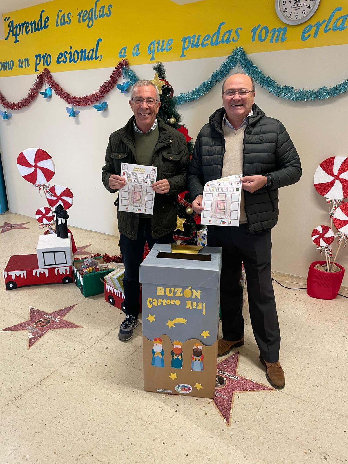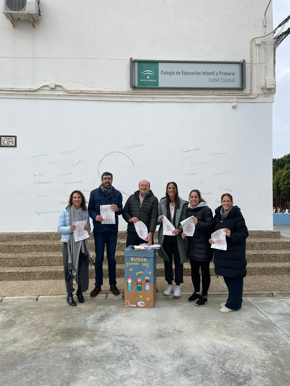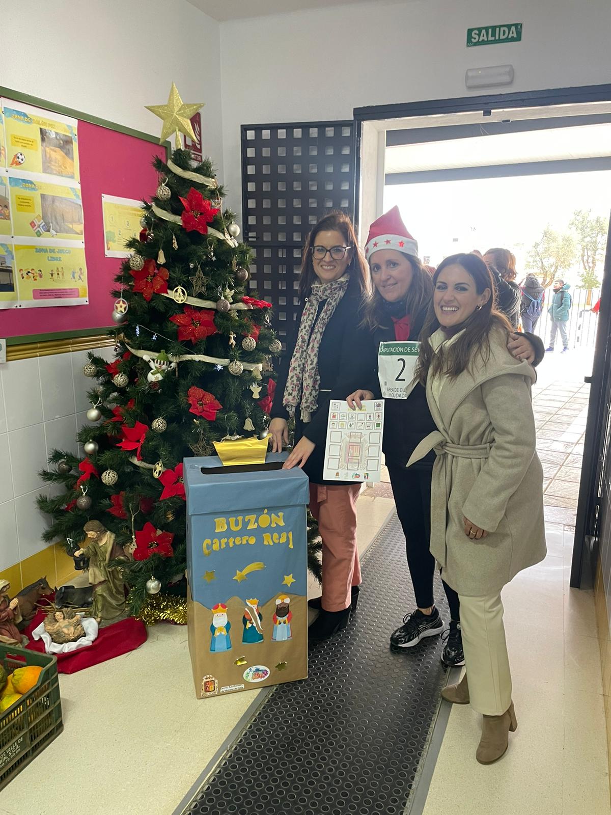 Las concejalas de Comunicación, Movilidad y Educación, Belén Gutiérrez, Ana María Guillén y Gloria Guillén, respectivamente, y Manolo Bustos de la Asociación Amigos de los Reyes Magos han repartido esta mañana los buzones de la Cartera Real en todos los colegios de la localidad, junto a unas cartas con pictogramas para que todos los menores maireneros hagan sus peticiones esta Navidad.