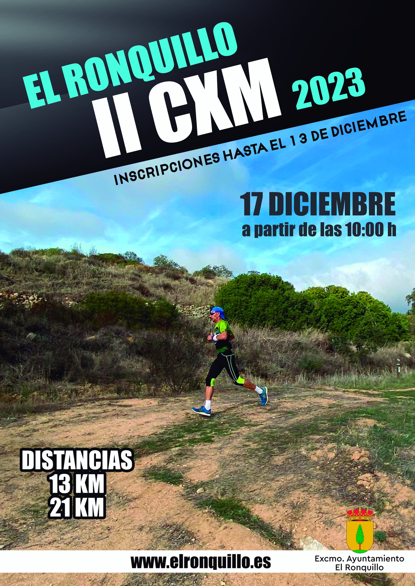 LLEGA LA II CXM DE EL RONQUILLO El próximo domingo 17 de diciembre se celebrará la II Carrera por montaña de nuestro municipio. Distancias de 13 y 21 km. ¡inscríbete! Las personas interesadas en inscribirse a esta prueba pueden hacerlo en el siguiente enlace hasta el 13 de diciembre. https://inscripciones.croniussport.es/.../ii-cxm-el.../ Organiza: Excmo. Ayuntamiento de El Ronquillo