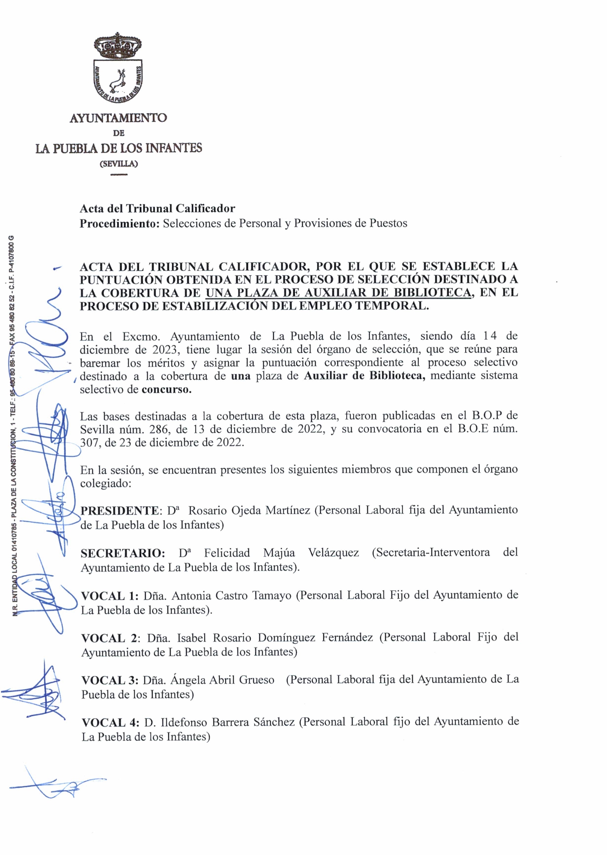 Imagen Imágenes Ubicación Categoría noticia Empleo Mostrar en el carrusel de la sección No Fecha Jue, 14/12/2023 - 15:09 Más información http://www.lapuebladelosinfantes.es/es/actualidad/noticias/Acta-del-Tribunal-Ca…