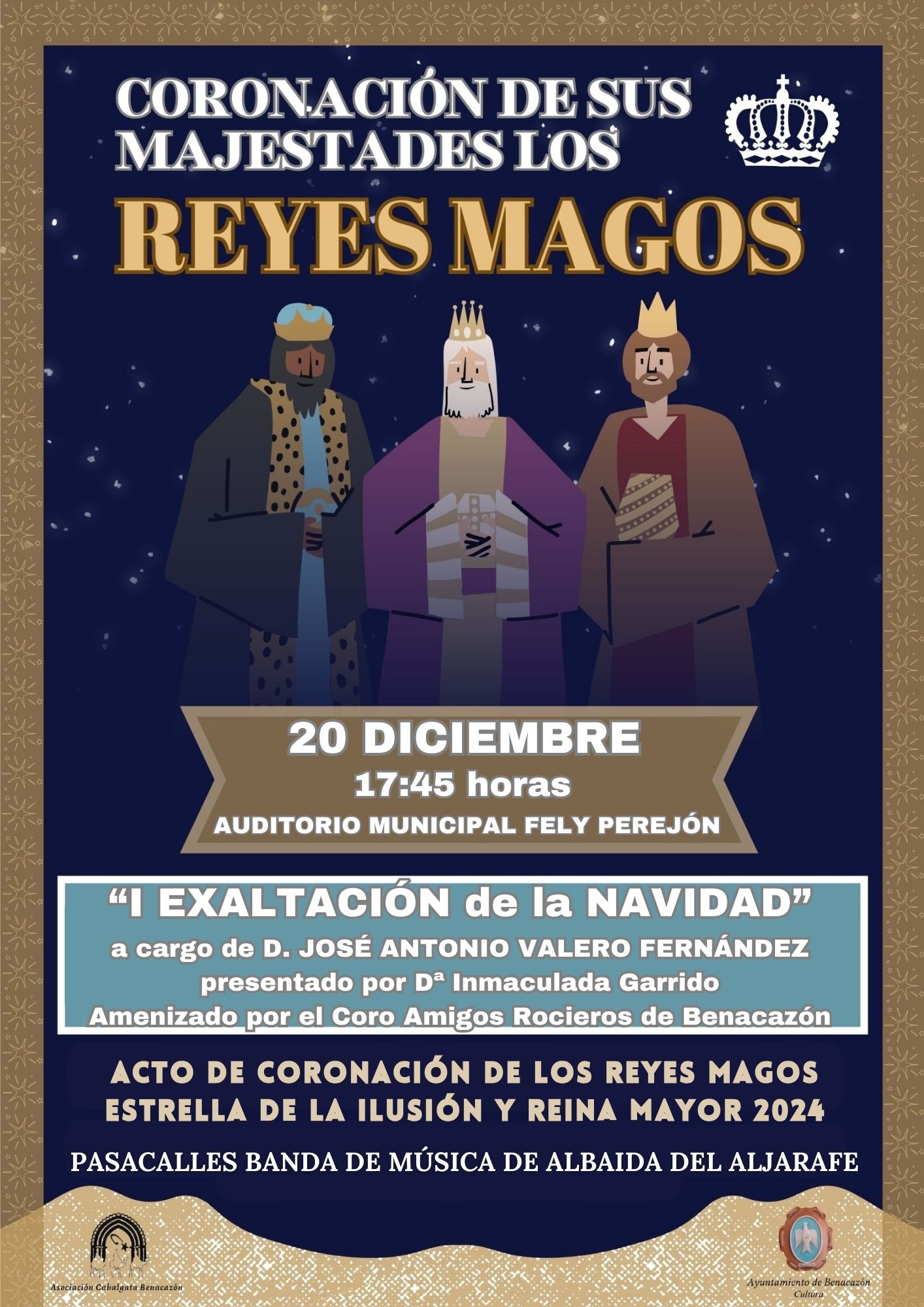 El Ayuntamiento de Benacazón informa que el próximo miércoles 20 de Diciembre de 2023 se celebra el acto de PRESENTACIÓN OFICIAL Y CORONACIÓN DE SUS MAJESTADES LOS REYES MAGOS DE ORIENTE, LA ESTRELLA DE GUÍA Y REINA MAYOR, que tendrá lugar en el Auditorio Municipal Fely Perejón a las 17:45 horas, organizado por la Asociación de la Cabalgata de Benacazón. Donde este año asistiremos además a la "I EXALTACIÓN DE LA NAVIDAD" a cargo de D. José Antonio Valero Fernández, presentado por Dña. Inmaculada Garrido Fernández. El acto estará amenizado por el Coro AMIGOS ROCIEROS de Benacazón. Esa misma tarde, a partir de las 17:00 h., disfrutaremos de un alegre Pasacalles de la Banda de Música de Albaida del Aljarafe. Desde el Ayuntamiento de Benacazón esperamos que vecinos y visitantes -que se acercan estos días hasta nuestra localidad- se animen a participar, acompañados por familiares y amigos, de todas las actividades que componen la amplia Programación "VIVE LA NAVIDAD EN BENACAZÓN 2023/2024".