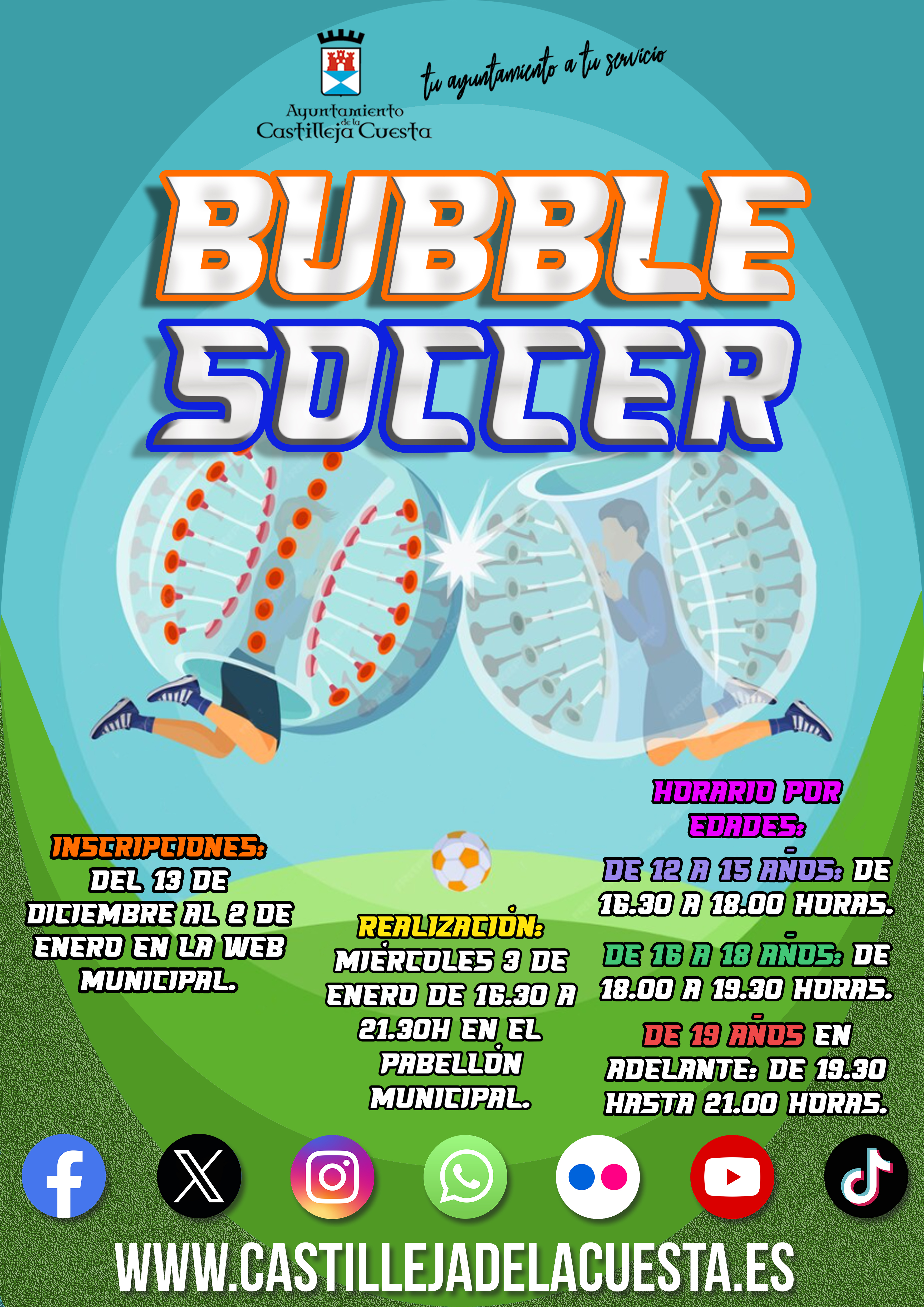 INSCRIPCIONES AQUÍ Fecha inicio Mié, 03/01/2024 - 13:07 Fecha fin Mié, 03/01/2024 - 13:07 Imágenes Ubicación Categoría evento Ciudadanía Mostrar en el carrusel de la sección No Más información http://www.castillejadelacuesta.es/es/actualidad/eventos/Bubble-Soccer/