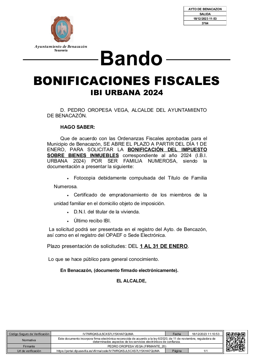 El Ayuntamiento de Benacazón informa que, de acuerdo con las Ordenanzas Fiscales aprobadas para el Municipio de Benacazón, SE ABRE EL PLAZO A PARTIR DEL DÍA 1 DE ENERO de 2024, PARA SOLICITAR LA BONIFICACIÓN DEL IMPUESTO SOBRE BIENES INMUEBLES correspondiente al año 2024 (I.B.I. URBANA 2024) POR SER FAMILIA NUMEROSA, debiendo presentar la siguiente documentación: