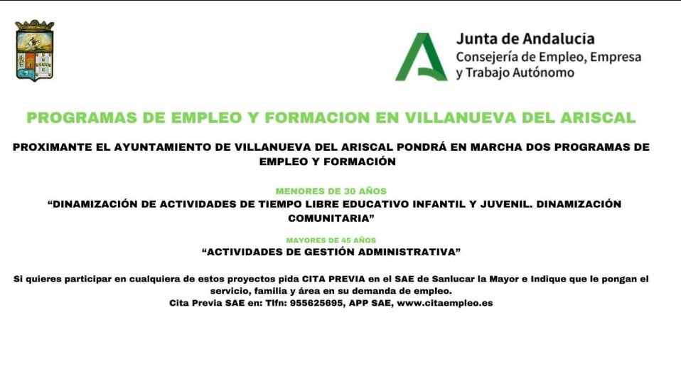 Si está interesado en el curso de menores de 30 años, ''DINAMIZACIÓN DE ACTIVIDADES DE TIEMPO LIBRE EDUCATIVO INFANTIL Y JUVENIL'' y ''DINAMIZACIÓN COMUNITARIA'', pida cita en el SAE de Sanlúcar la Mayor, indicando que pongan en su demanda de empleo, el código 370, la familia 284 y el área 76000.