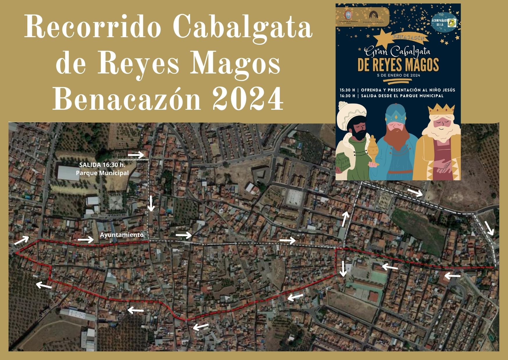 El Ayuntamiento de Benacazón informa que La Gran Cabalgata de Reyes Magos de Benacazón se celebrará el próximo 5 de Enero de 2024, compuesta por un total de ocho carrozas, con el siguiente horario: - A las 15:30 h: el Cortejo realizará una Ofrenda Floral y Presentación al Niño Jesús en la Iglesia Parroquial Santa María de las Nieves. - Seguidamente, a las 16:30 h: Salida de la Cabalgata desde la Caseta Polivalente del Parque Municipal, acompañada de la "Charanga Los Pingüinos". Organizada por el Ayuntamiento de Benacazón, con la colaboración de la Asociación de la Cabalgata, nuestr@s niñ@s vivirán un año más la ilusión de recibir y acompañar a Sus Majestades los Reyes Magos de Oriente durante la tarde-noche del 5 de Enero, el día más importante y esperado para los más pequeños de la casa. **Los Reyes Magos, Reina Mayor y Estrella de la Ilusión estarán representados por: - : José Manuel Bau Ramos - : Isabel Barbero Amores - : Julio Adame Ortiz - : Reme Marín Cabra - ́: Alba Muñoz Leal Este año volveremos a disfrutar de la Cabalgata por avenidas amplias, así como por su recorrido tradicional entre las calles más céntricas del municipio. Decisión acordada entre la Asociación de la Cabalgata y el Ayuntamiento, por el lucimiento y disfrute de nuestra Cabalgata de Reyes Magos. **RECORRIDO 2024: - Parque Municipal - Los Jaenes - Real - La Carretera - Velázquez - Avda. Pedro de la Rosa - Donantes - Avda. de Andalucía - El Carpio - San José - Santa María de las Nieves - San Fernando - Plaza Cruz Mármol - Real hasta el Ayuntamiento, donde culminará la Cabalgata de Reyes Magos 2024. *Desde el consistorio se quemará un gran castillo de FUEGOS ARTIFICIALES a la llegada de las carrozas. Descárgate el recorrido en la siguiente imagen: