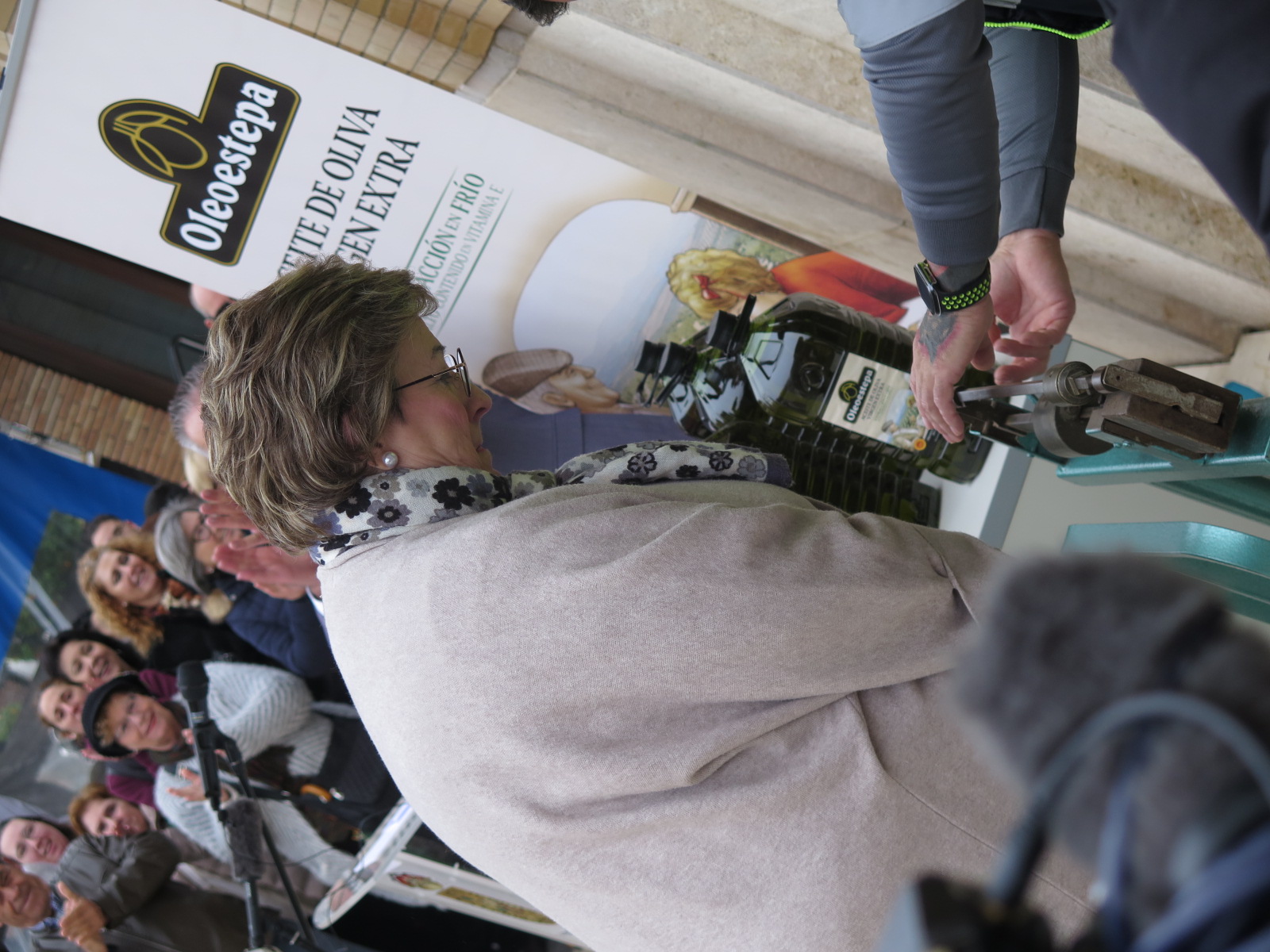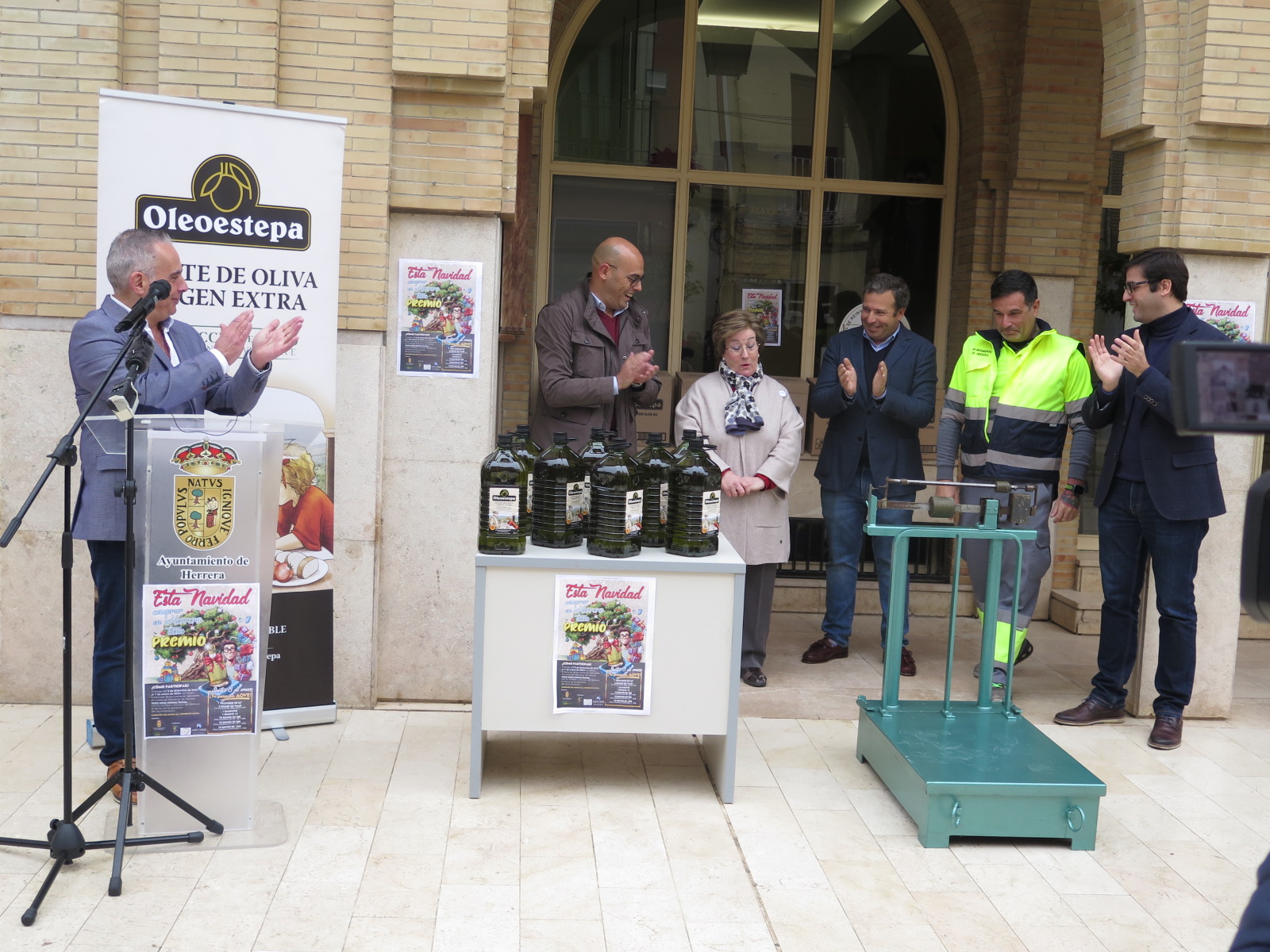 Cuando el presentador del acto ha nombrado a la ganadora, Remedios ha salido del ayuntamiento recibiendo una fuerte ovación por parte de los presentes. Además de medios de comunicación locales y nacionales, "nunca pensaba que esta campaña pudiera tener tanta repercusión" ha incidido el primer teniente de alcalde, Alejandro Suárez, por ello "destaco la excelente colaboración de las cooperativas que han donado el aceite, Agropecuaria Herrera, La Purísma y Oleoestepa. Y como no puede ser de otra manera, a la asociación de empresas y comerciantes, (ASECOHE), ha comentado el edil. Resalto igualmente la labor realizada por nuestro gabinete de comunicación, del personal se servicios. Además agradece a Nicolás Pineda (Frutas Pineda) "que nos haya prestado la báscula para este pesaje".