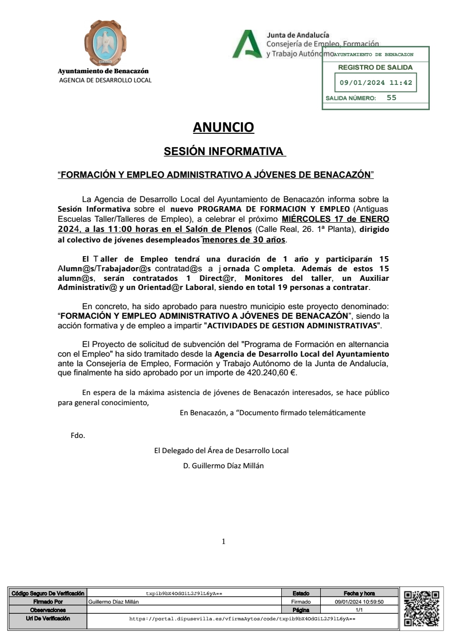 El Ayuntamiento de Benacazón, a través de la Agencia de Desarrollo Local informa de la próxima Sesión Informativa sobre el nuevo PROGRAMA DE FORMACIÓN Y EMPLEO en "ACTIVIDADES DE GESTIÓN ADMINISTRATIVAS" (antiguas Escuelas Taller/Talleres de Empleo), a celebrar el MIÉRCOLES 17 de ENERO de 2024 a las 11:00 horas en el Salón de Plenos (Calle Real, 26. 1ª Planta), dirigido al colectivo de jóvenes desempleados menores de 30 años.