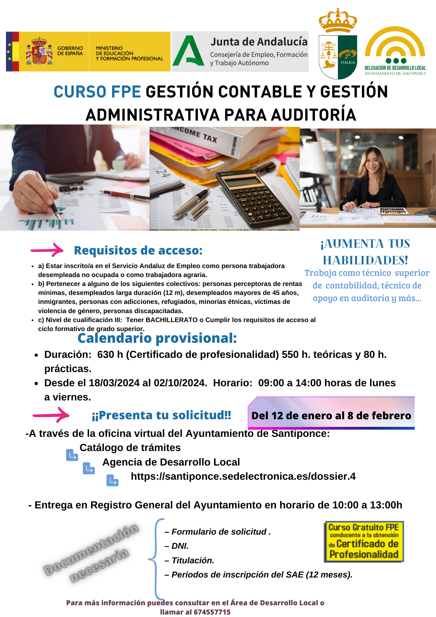 A partir de mañana 12 de enero y hasta el próximo 8 de febrero, podrás presentar tu solicitud para apuntarte al Curso FPE Gestión Contable y Gestión Administrativa para Auditoría que imparte el Ayuntamiento de Santiponce y que comenzará el próximo 18 de marzo de 2024.
