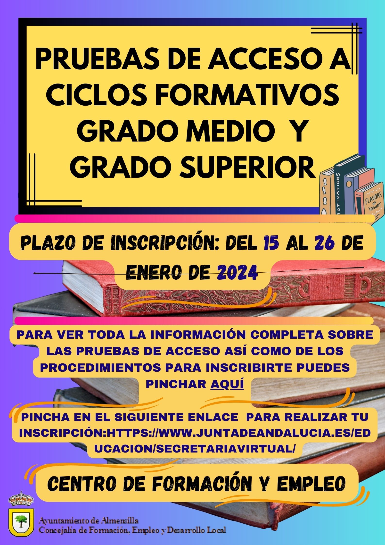 Informamos que hasta el próximo 26/01/24 se encuentra abierto el plazo de solicitud para la convocatoria 2024 de las pruebas de acceso a ciclos formativos de grado medio y superior.