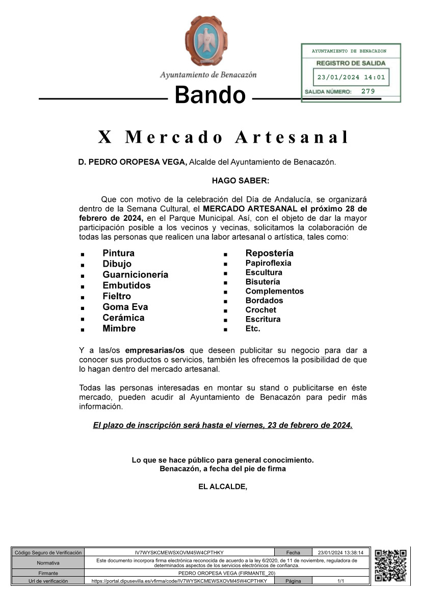 El Ayuntamiento de Benacazón informa que, con motivo de la celebración del Día de Andalucía, la Delegación municipal de Turismo organiza el X MERCADO ARTESANAL para el próximo 28 de febrero de 2024 en el Parque Municipal.