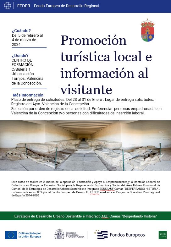 Este curso se realiza en el marco de la operación "Formación y Apoyo al Emprendimiento y la Inserción Laboral de Colectivos en Riesgo de Exclusión Social para la Regeneración Económica y Social del Área Urbana Funcional de Camas" de la Estrategia de Desarrollo Urbano Sostenible e Integrado EDUSI AUF Camas "DESPERTANDO HISTORIA", cofinanciada en un 80% por el Fondo Europeo de Desarrollo FEDER, mediante el Programa Operativo Plurirregional de España 2014-2020.
