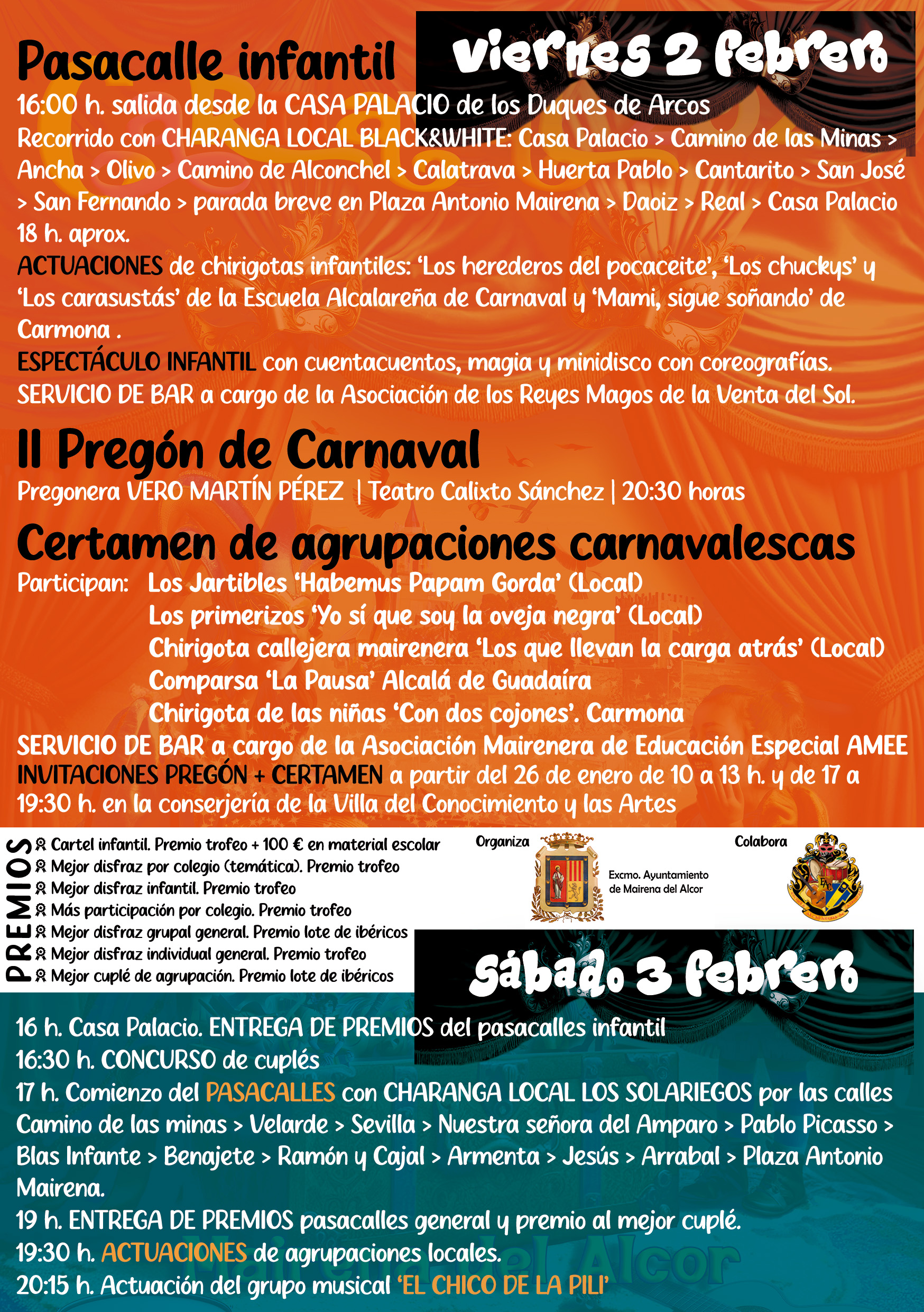 Fecha inicio Vie, 02/02/2024 - 16:00 Fecha fin Sáb, 03/02/2024 - 23:59 Imágenes Ubicación Categoría evento Cultura Mostrar en el carrusel de la sección No Más información http://www.mairenadelalcor.es/es/actualidad/eventos/CARNAVAL-00005/