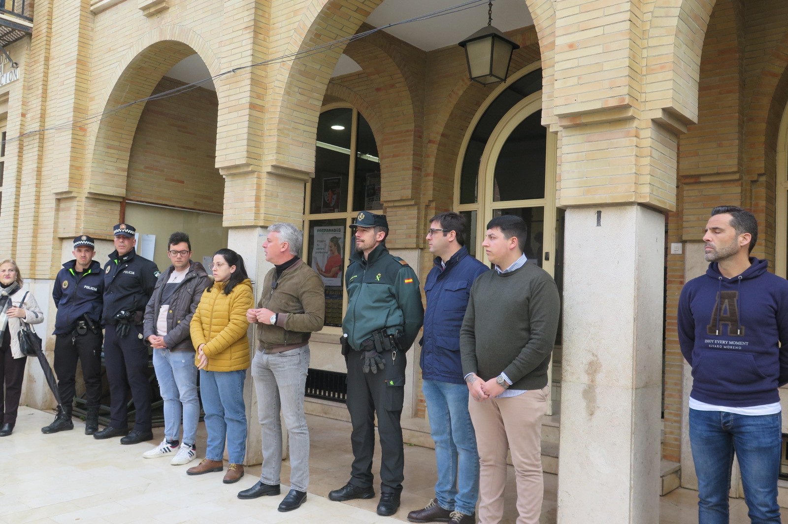 Miembros de la Corporación Municipal, Guardia Civil, Policía Local y vecinos de este municipio, han mostrado su apoyo a la Benemérita guardando un minuto de silencio en la puerta de consistorio. Un minuto de silencio por el "asesinato de los guardias civiles, Miguel Ángel y David, hecho ocurrido en Barbate", así lo ha expresado el alcalde, Jorge Muriel en su intervención.
