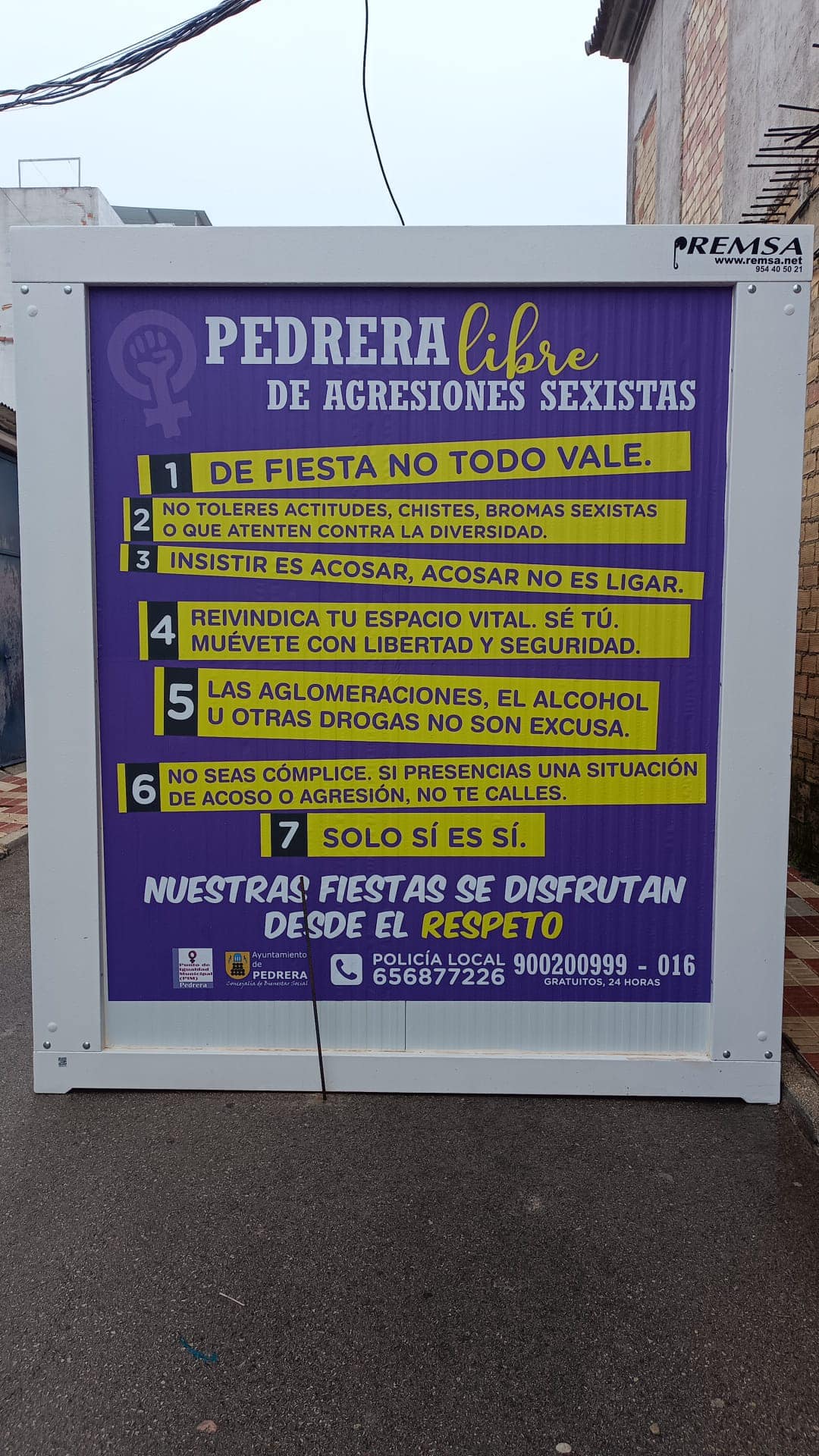 Para ello, se ha instalado un cartel en los baños portátiles con varios mensajes claros: "De fiesta no todo vale"; "No toleres actitudes, chistes, bromas sexistas o que atenten en contra de la diversidad"; "Insistir es acosar, acosar no es ligar", "Reivindica tu espacio vital. Sé tú. Muévete con libertad y seguridad"; "Las aglomeraciones ni el alcohol son excusas"; "No seas cómplice. Si presencias una situación de acoso o agresión no te calles"; o "Solo sí es sí".