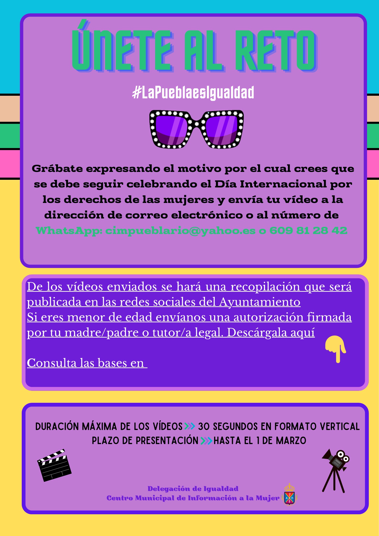 El reto que te proponemos es el siguiente: Grábate expresando el motivo por el cual crees que se debe seguir celebrando el Día Internacional por los derechos de las mujeres, y envía tu vídeo a la dirección de correo electrónico cimpueblario@yahoo,es , o con un mensaje al WhatsApp 609812842.