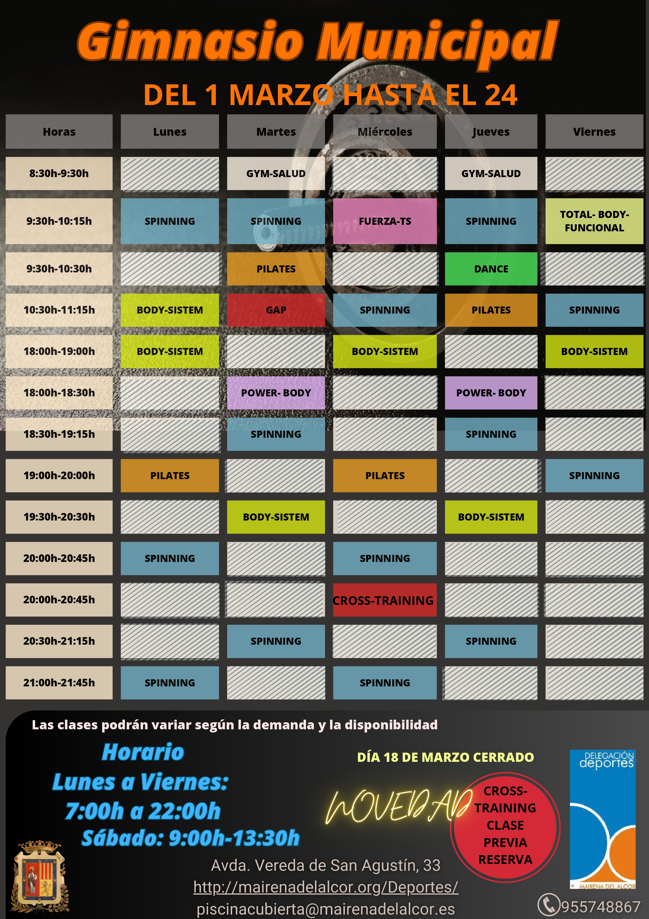 Tarifas 2023 Imagen Imágenes Ubicación Categoría noticia Deportes Mostrar en el carrusel de la sección No Fecha Lun, 26/02/2024 - 10:34 Más información http://www.mairenadelalcor.es/es/actualidad/noticias/Marzo-en-el-gimnasio-munic…