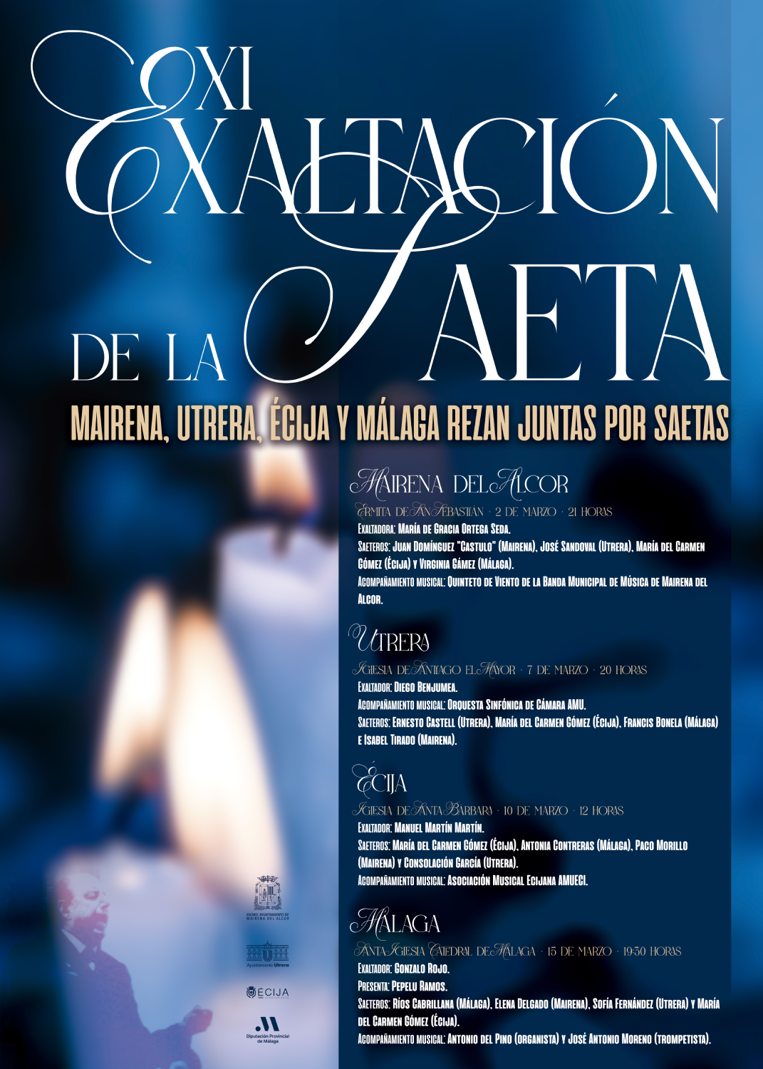 Los saeteros para este primer día son Juan Domínguez "Cástulo" por Mairena del Alcor, José Sandoval por Utrera, María del Carmen Gómez por Écija y Virgina Gámez por Málaga, acompañados por la música del Quinteto de viento de la Banda Municipal de Música de Mairena del Alcor.