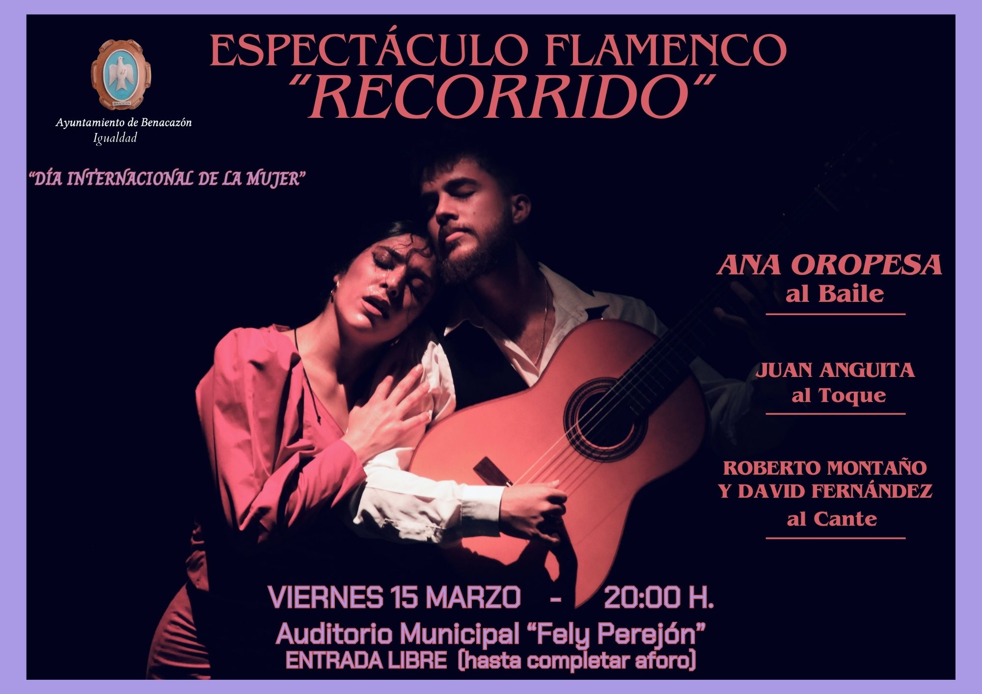 - Viernes 15 marzo - 20:00 h: REPRESENTACIÓN MUSICAL DE FLAMENCO "RECORRIDO" en Auditorio Municipal Fely Perejón (ENTRADA LIBRE hasta completar aforo).