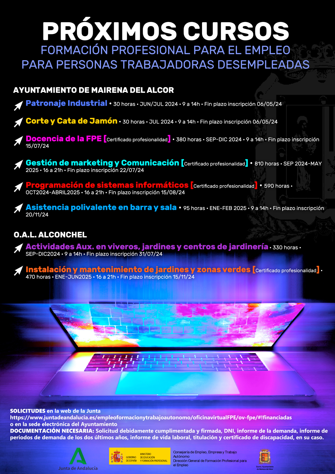 El Ayuntamiento de Mairena del Alcor y el Organismo Autónomo Local Alconchel están desarrollando un programa de cursos de Formación Profesional para el Empleo dirigidos a personas desempleadas y subvencionados por la Junta de Andalucía.