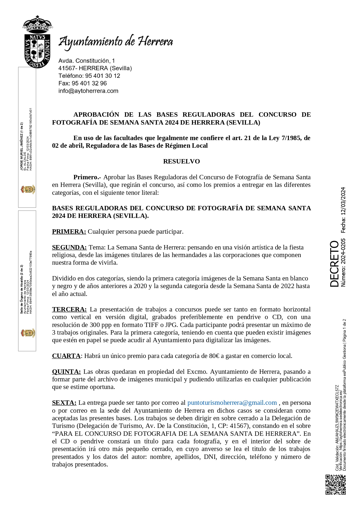 La concejalía de Turismo del Ayuntamiento de Herrera con la colaboración del Consejo General de Hermandades y Cofradías de la villa, convoca el I Concurso de Fotografía de Semana Santa 2024.