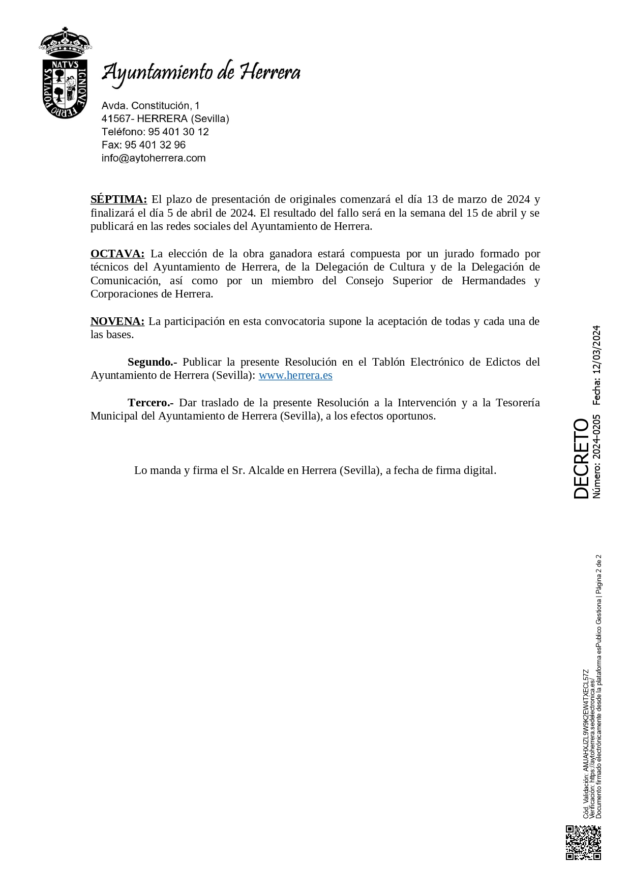 Habrá un único premio para cada categoría de 80€ a consumir en el comercio local. El plazo de presentación de originales comenzará el día 13 de marzo de 2024 y finalizará el día 5 de abril de 2024. El resultado del fallo será en la semana del 15 de abril y se publicará en las redes sociales del Ayuntamiento de Herrera.