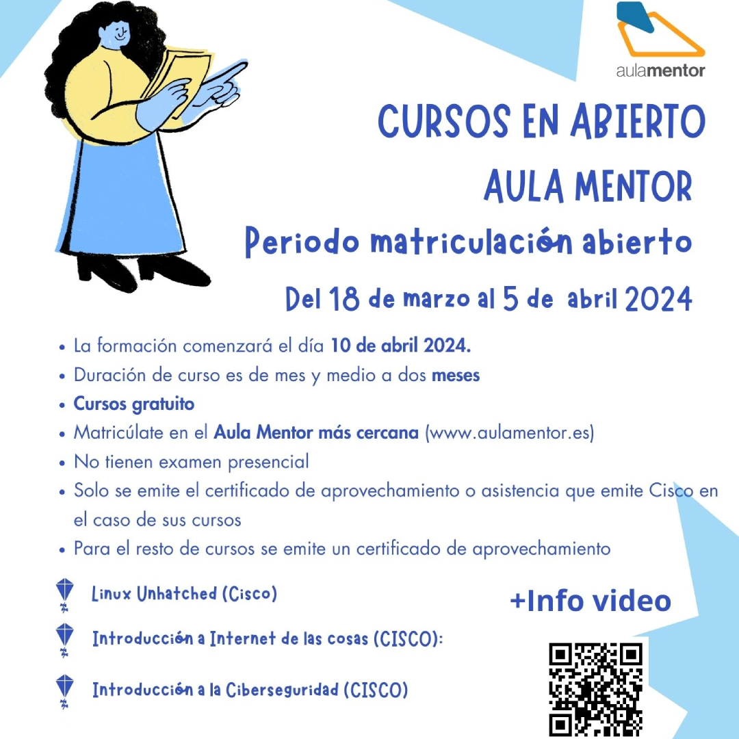 Aula Mentor pone en marcha una nueva convocatoria de los cursos gratuitos Mentor en Abierto. La inscripción se lleva a cabo en el Aula Mentor Mairena del Alcor, enviando un correo a la dirección mairenadelalcor@aulamentor.es indicando el curso a realizar, en el plazo comprendido entre el 18 de marzo al 5 de abril.