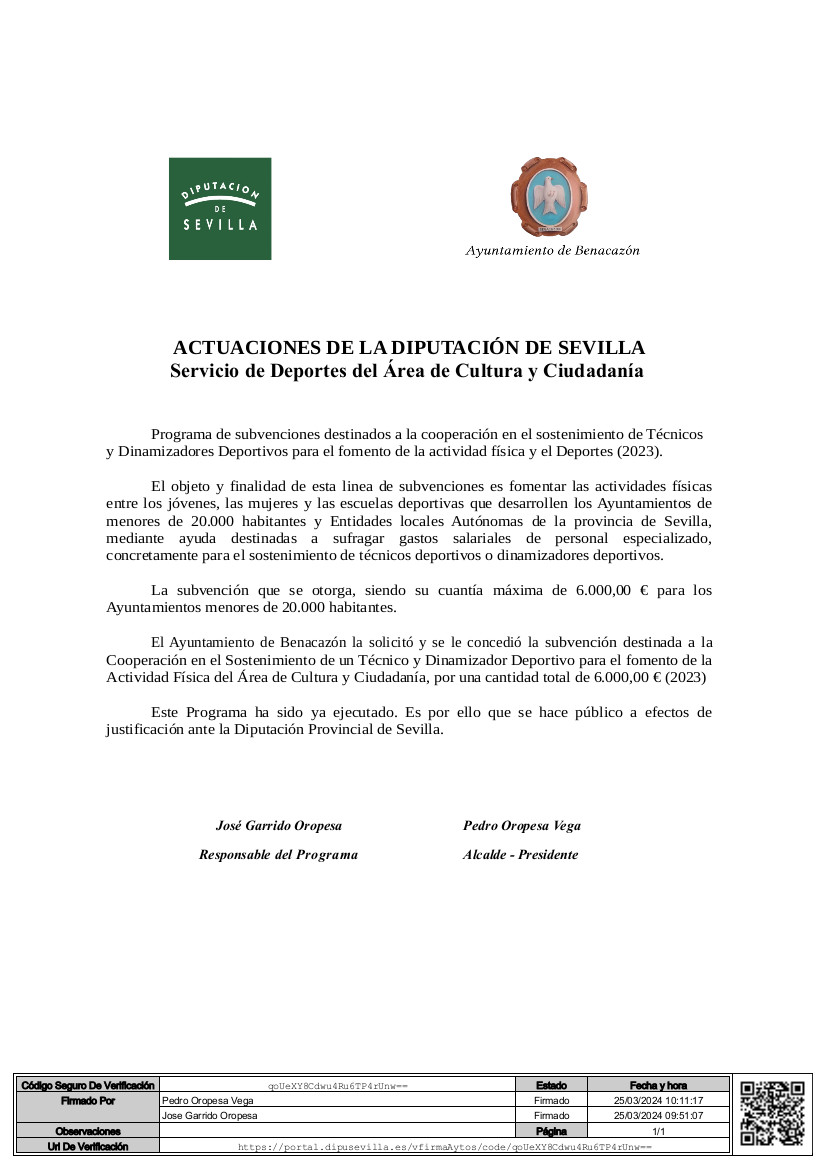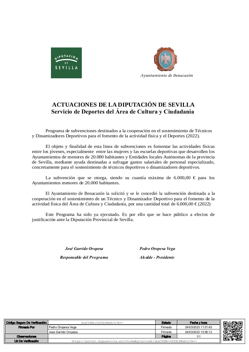 El Ayuntamiento de Benacazón informa, a efectos de justificación ante la Diputación Provincial de Sevilla (Servicio de Deportes del Área de Cultura y Ciudadanía), sobre el Programa de subvenciones destinados a la cooperación en el sostenimiento de Técnicos y Dinamizadores Deportivos para el fomento de la actividad física y el Deporte (2023).