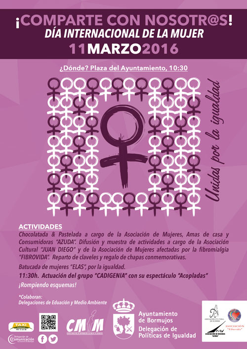 Fecha inicio Vie, 11/03/2016 - 10:30 Fecha fin Vie, 11/03/2016 - 15:00 Imágenes Ubicación Categoría evento Educación Mostrar en el carrusel de la sección No Dirección Plaza del Ayuntamiento. 10:30 Más información http://www.bormujos.es/actualidad/eventos/Actividades-por-el-Dia-de-la-Mujer/