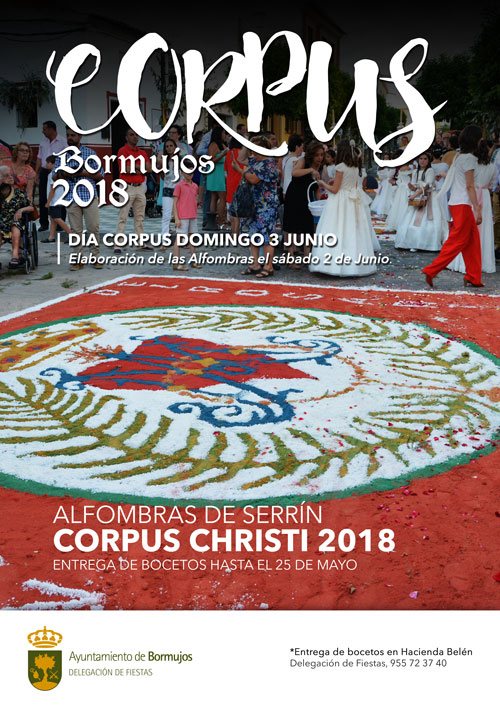 Si quieres elaborar una alfombra de arena para festejar el Corpus Christi, hasta el próximo 25 de mayo puede presentar tu boceto en la Delegación de Fiestas (Hacienda Belén 955723740). Las calles del pueblo se adornarán con símbolos, dibujos y coloridos mensajes el próximo día 2 de junio en una fiesta participativa de los vecinos que organiza el Ayuntamiento de Bormujos, a través de la Delegación de Fiestas. El domingo día 3 tendrá lugar la procesión por el centro del pueblo. Apúntate ya para contar con los colores y el material que te facilita el Ayuntamiento!!