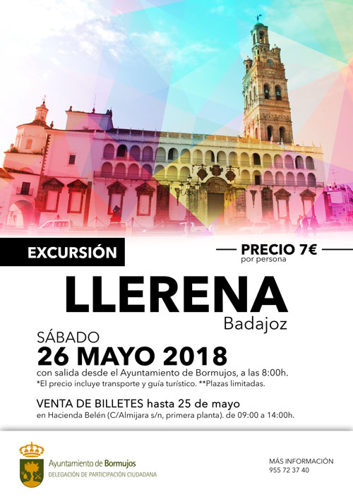 El Ayuntamiento de Bormujos te lleva a conocer la localidad de Llerena, en Badajoz, en una excursión organizada por la Delegación de Participación Ciudadana, que tendrá lugar el sábado 26 de mayo. El viaje, por 7 euros, incluye el transporte y un guía turístico que explicará los lugares más destacados de este pueblo extremeño. La salida tendrá lugar a las 8:00 horas desde la plaza del Ayuntamiento.