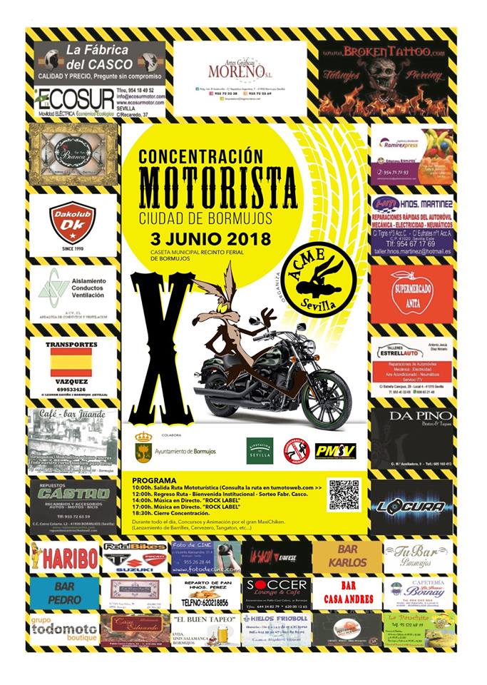 Este domingo 3 de junio te invitamos a la X Concentración Motorista 'Ciudad de Bormujos' de Acmesevilla Motoclub Bormujos. Comenzará a las 10:00h. con la salida de la ruta mototurística (Consulta recorrido aquí: http://www.tumotoweb.com/…/x-concentracion-motorista-ciuda…/), la cuál finalizará a las 12h. en el recinto ferial de Bormujos con la bienvenida institucional.