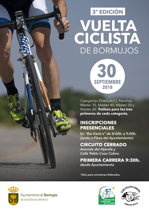 Este domingo Bormujos volverá a llenarse de maillots de colores en la 3ª Edición de la Carrera Ciclista de Bormujos. El 30 de septiembre, la Federación Andaluza de Ciclismo, el Club ciclista Caracol con la colaboración del Ayuntamiento de Bormujos, a través de la Delegación de Deportes, organiza este circuito para las categorías Élite/sub 23, féminas, Máster 30, Máster 40, Máster 50 y Máster 60.