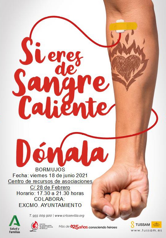 El Centro de Transfusión, Tejidos y Células de Sevilla, con la colaboración del Ayuntamiento de Bormujos organiza el próximo viernes 18 de junio una jornada de donación de sangre.