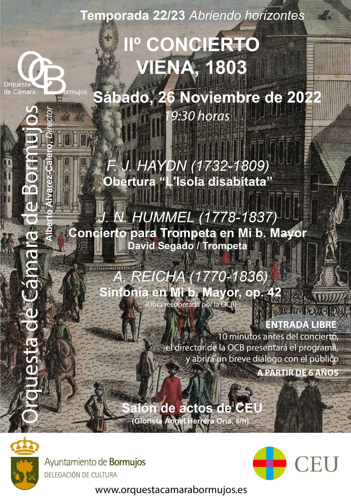 El próximo sábado día 26 de noviembre la Orquesta de Cámara de Bormujos - OCB vuelve en su temporada 'Abriendo horizontes' con un concierto para trompeta de Hummel, teniendo como solista a David Segado Ramírez.